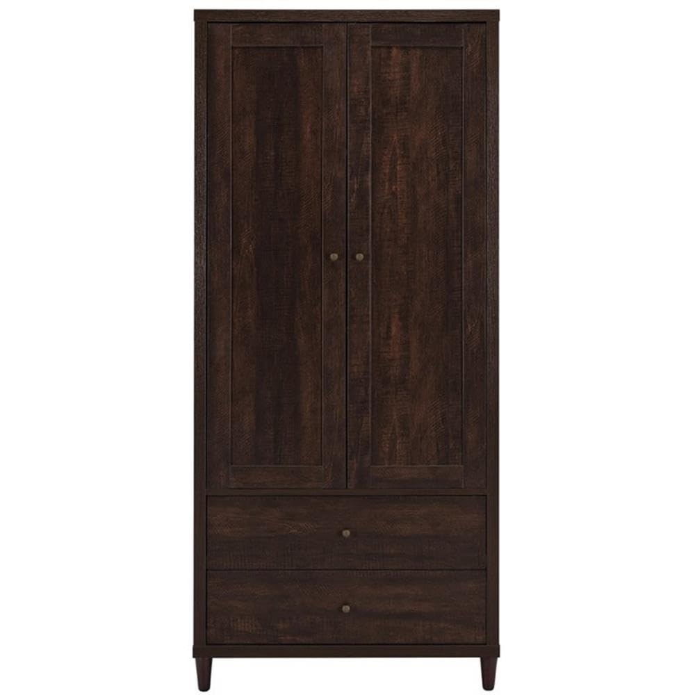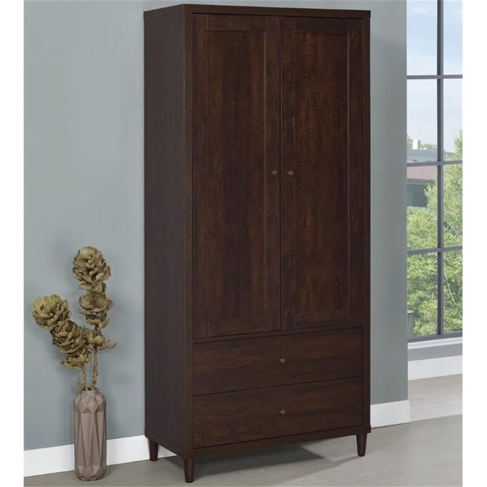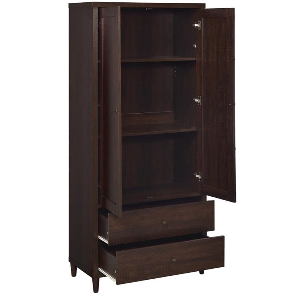 This impressive accent cabinet imparts an imposing presence to the home. At over six feet tall, it has the capacity to take on all storage needs. Two doors open up to ample space. Below are two deep drawers for additional storage of everything from sofa covers to extra plateware. The cabinet is finished in rustic tobacco for a warm, inviting ambiance.