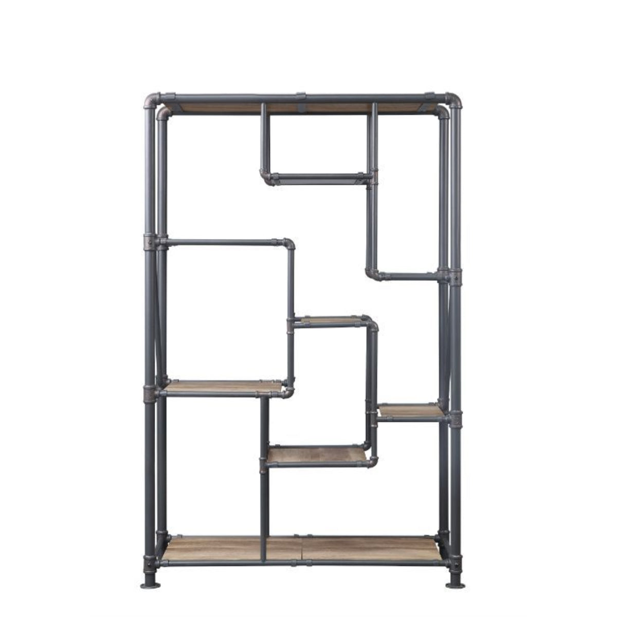 The rich antique oak and sandy gray finish add depth to the pieces. This bookshelf is composed of high-quality materials that will last for years to come. Metal tube design adds a touch of industrial feelin its design. The bookcase features shelves in various heights and sizes to create a unique and striking look, perfect for displaying all your home decor items in one place.