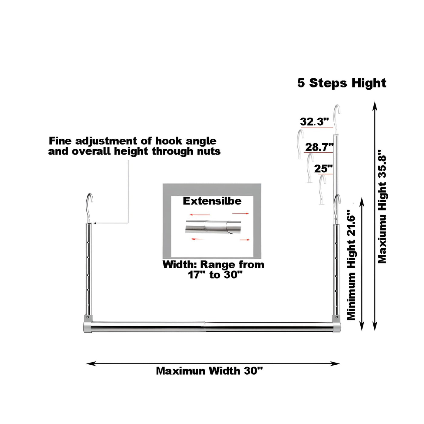 Looking For A Way To Maximize Your Wardrobe Space? Look No Further Than Our Adjustable Hanger Rod! Made Of Sturdy And Durable Stainless Steel, This Rod Can Support Up To 33 Pounds In The Middle, So You Can Hang All Your Favorite Clothes Without Worrying About It Buckling Under The Weight. The Extendable Design Allows It To Adjust In Length From 17Inch To 30Inch And In Height From 21.6 Inch To 33 Inch With Five Steps - No Tools Required! And Because It Can Be Used In A Variety Of Indoor And Outdoor Settings, You'Ll Find Countless Uses For It Around The House. Whether You'Re Hanging Flower Pots On The Balcony Or Towels In The Bathroom, This Versatile Hanger Rod Is Sure To Make Your Life Easier.