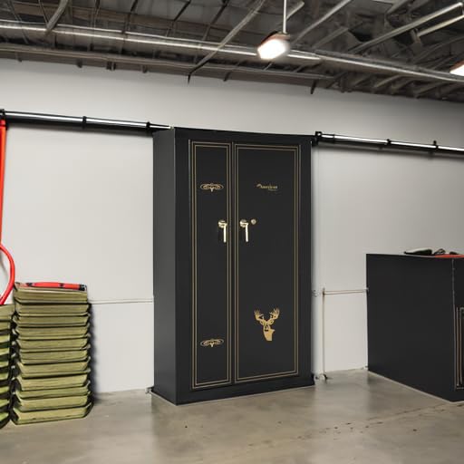 Product DescriptionThis spacious 16-gun metal cabinet is crafted for the serious firearm and hunting enthusiast, offering ample room and secure storage in a rugged, streamlined design. Constructed with durable steel and finished in a resilient black powder coat, the cabinet is built to withstand the test of time. Inside, soft padded gun rests protect up to 16 firearms from scratches, keeping each one firmly in place. Featuring a keyed three-pin locking mechanism, the cabinet ensures that firearms stay safely secured. Designed with two lockable compartments, one door provides dedicated space for firearms, while the other offers organized storage for ammunition and hunting accessories. The cabinet’s exterior is accented by sleek silkscreened stripes and a bold deer head silhouette, bringing a touch of style to this secure and reliable storage solution.From the ManufacturerThis 16 gun metal cabinet has a powder coated, scratch resistant finish with gold accents and striping. Wood grain accents the interior of this ready to assemble cabinet.