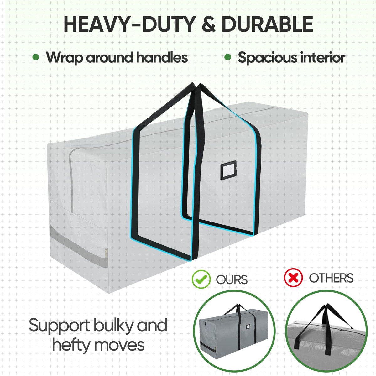 Q: How durable is the BALEINE Christmas tree storage bag?A: The BALEINE storage bag is constructed from heavy-duty, tear-resistant material and features reinforced handles, ensuring it can support the weight of your tree and withstand regular handling.