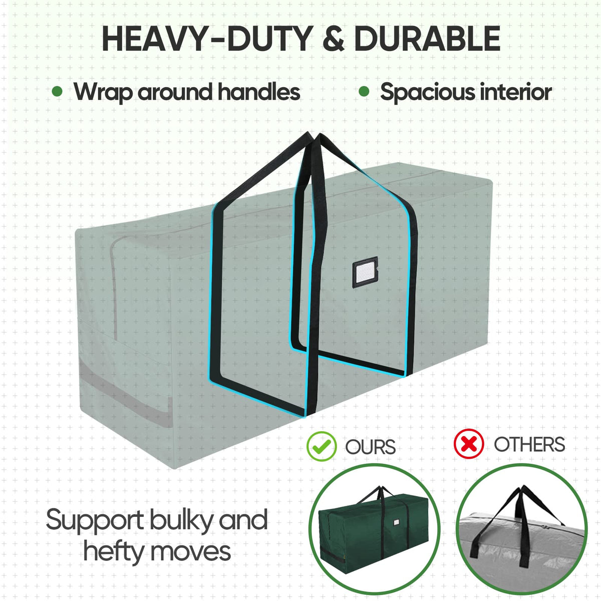 Q: How durable is the BALEINE Christmas Tree Storage Bag?A: The BALEINE bag is constructed from heavy-duty, tear-resistant materials, and features reinforced handles for added strength, ensuring it can hold and protect your Christmas tree year after year.