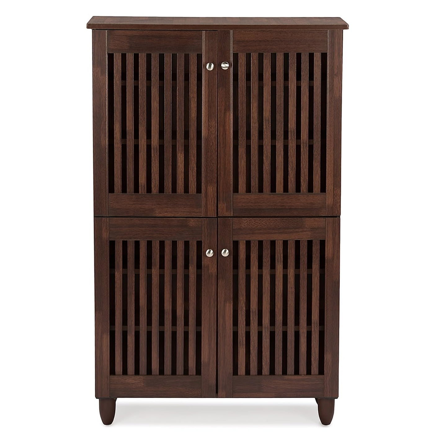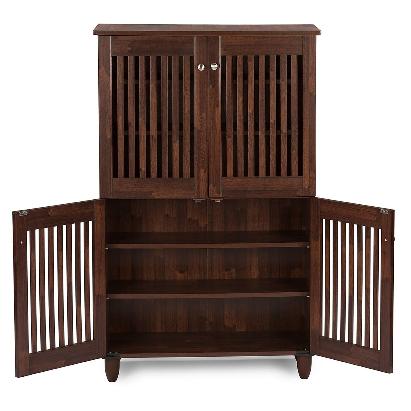 This Smartly-Designed Shoe Cabinet, From The Esteemed House Of Baxton Studio, Does Not Occupy Too Much Floor Space As It Is Tall And Spacious. Simple And Elegant Design Make This One Of Those Pieces Of Furniture That Is Easy To Complement. Perfect For Families And People How Have A Fetish For Footwear, The Shoe Cabinet Can Accommodate Up To Eighteen Pairs Of Shoes In The Tall Cabinet With Two Of Its Fixed Shelves Behind Each Door. To Match Your Modern And Contemporary Home Decor, The Doors Come With Silver Handle Pulls For Your Convenience. The Slatted Doors Allow Air Circulation, Which Is Essential For The Storage Of Shoes Helping To Keep Them Mold Free. Made In Malaysia, The Shoe Storage Cabinet Requires Assembly. -Made Of Engineered Wood -Has Oak Brown Finish -Has Four Doors And Six Shelves On The 4-Door Unit; Three Bigger Shelves And Three Smaller Shelves In The 3-Door Unit -The Door Has Metal Handles For Easy Opening And Closing -Doors Have A Magnetic Closing System -Legs Are Made Of Pvc -Can Hold Up To 18 Pairs Of Shoes In The 4-Door Cabinet And 12 Pairs Of Shoes In The 3-Door Cabinet -Assembly Required -Made In Malaysia -Overall Dimension: 4-Door Cabinet- 48.62 "H X 30.24" W X 13.23"D; 3-Door Cabinet-26.57" H X 44.88"W X 13.23" D -Shipping Dimension: 4-Door Cabinet - Carton 1: 4X47X16--36Lbs; Carton 2: 5"X32"X15"--40Lbs 3-Door Cabinet - 5X47X16--55Lbs