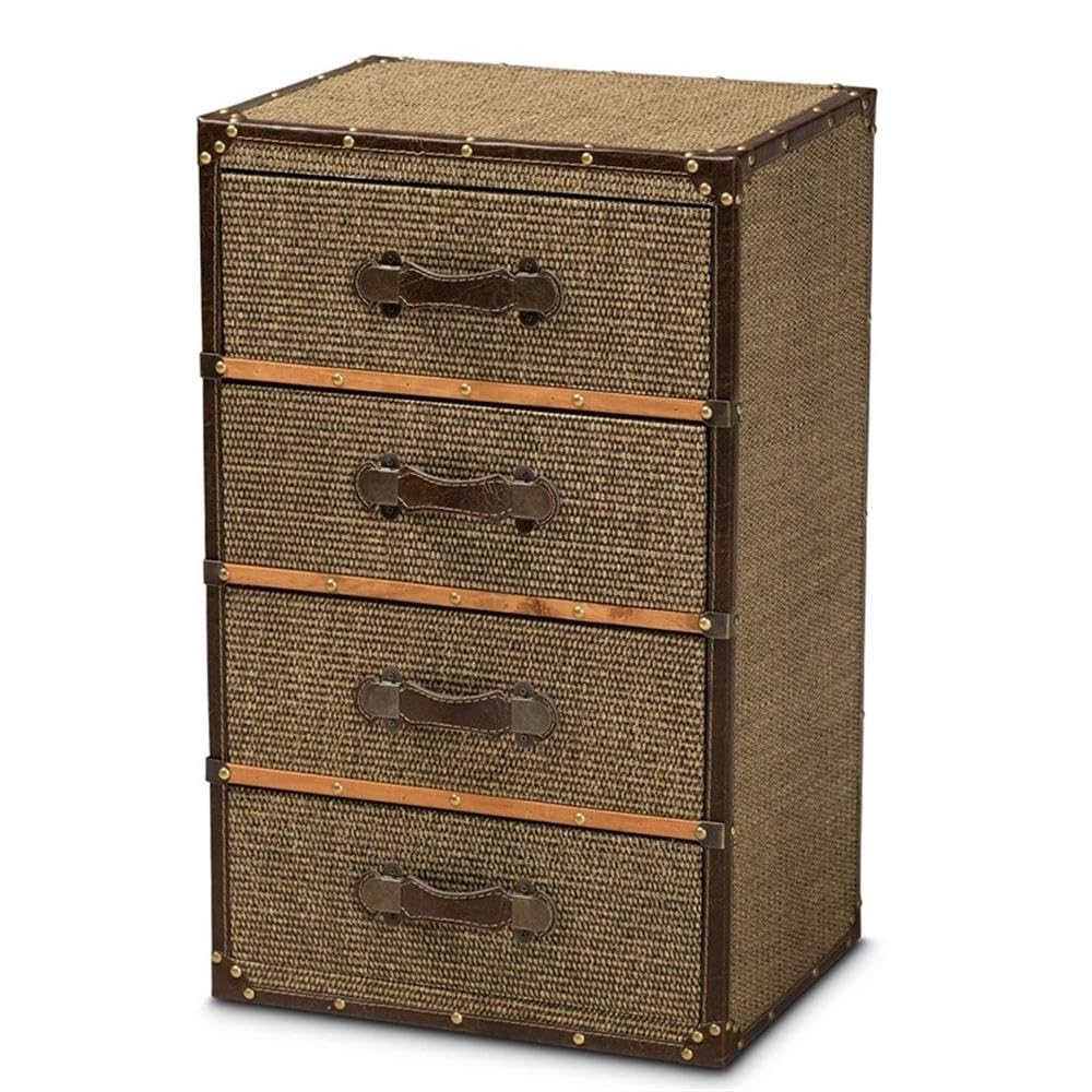 Traditional charm meets modern efficiency with the Owen accent storage cabinet. Made in China, this cabinet is comprised of a sturdy wood frame upholstered in brown fabric. Faux leather bands, accented with brass-tone metal studs, line the edges of the Owen to convey a vintage feel. Requiring assembly, the Owen features four spacious drawers to offer a convenient storage solution for busy areas of your home. Faux leather handles complete the look, making the Owen accent cabinet a fantastic addition to any space.