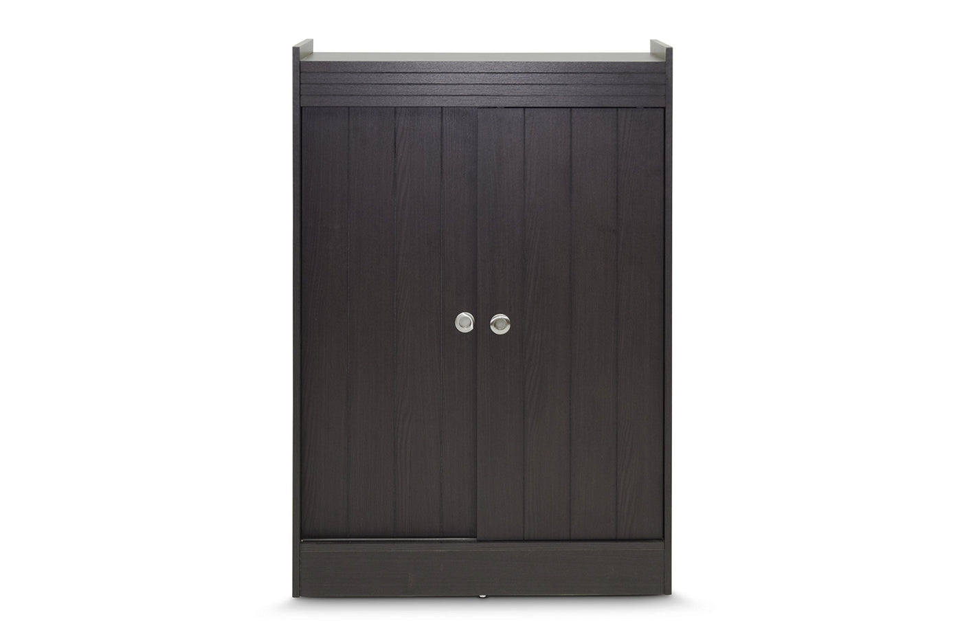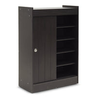 Shoes, shoes and more shoes. But you need space, space and more space. Our espresso shoe-rack cabinet helps you realize the potential of your home’s untapped vertical storage space. Imagine the convenience of quick access to 18 pairs of shoes, plus four more shelves and even a flat top for additional storage. This cabinet’s contemporary style features a wood grain-effect paper veneer to up the attractiveness factor. 30.75"W X 15"d x 45.1"h,shelf Dimension(5): 29.2"w X 12.1"d X 6.75"h.