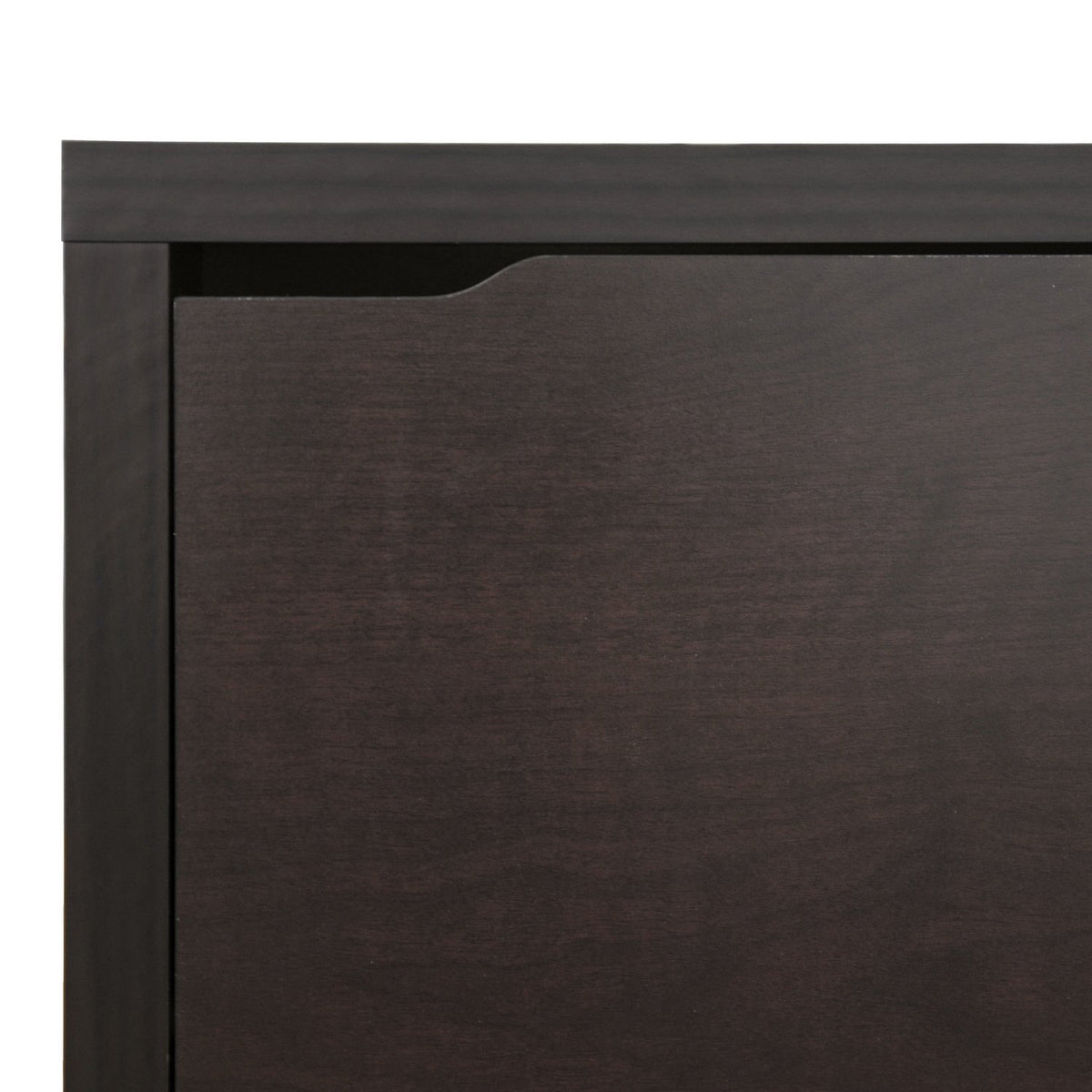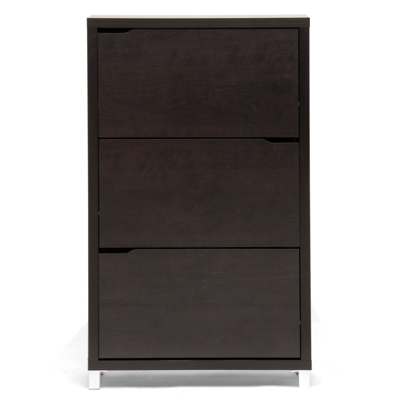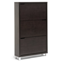 Stash your shoes stylishly in our Simms Shoe Cabinet. This modern shoe storage solution was designed with a low profile, svelte size as to fit neatly against a wall in a hallway, mud room, or entryway. Three storage compartments each fit six pairs of shoes comfortably for a total of approximately eighteen shoe slots, which varies depending upon your shoes' sizes. The unit is made in Malaysia with an engineered wood frame, faux maple wood grain paper veneer finish, plastic door supports and silver plastic legs. The Simms Shoe Cabinet requires assembly and should be dry dusted. Other sizes and colors are also offered (sold separately).Dimensions: 52.6 Inch high x 31.2 Inch wide x 9.1 Inch deep. Upper shelf: 3.25 Inch high x 26 Inch wide x 12.3 Inch deep, Lower shelf : 4.5 Inch high x 26 Inch wide x 12.3 Inch deep.