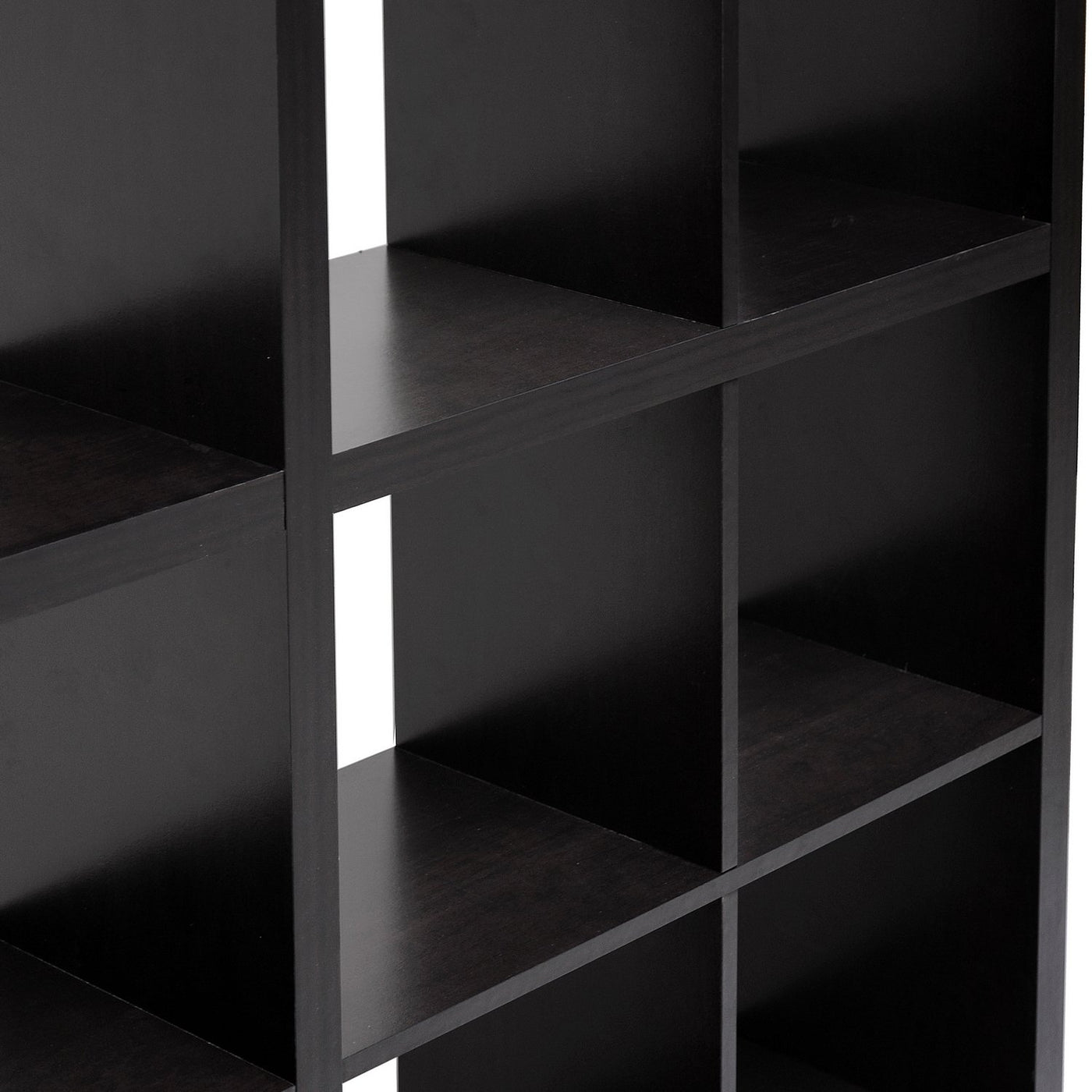 Why hide your book collection or treasures behind doors when you can display them elegantly? The Sunna Designer Shelving Unit is a 12 cube-based modern bookshelf made of dark brown faux wood grain paper veneer over a frame of engineered wood. Silver plastic legs with non-marking feet complete this Malaysian-made modern display unit. Assembly is required. To clean, wipe with a dry cloth. Dimensions: 61 Inch high x 58.25 Inch wide x 11.5 Inch deep Shelf dimensions(12): 13.25 Inch high x 13.25 Inch wide x 11.5 Inch deep.