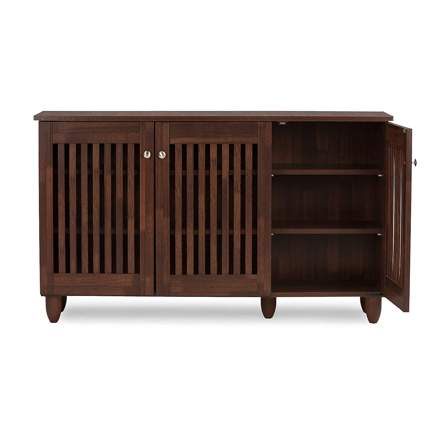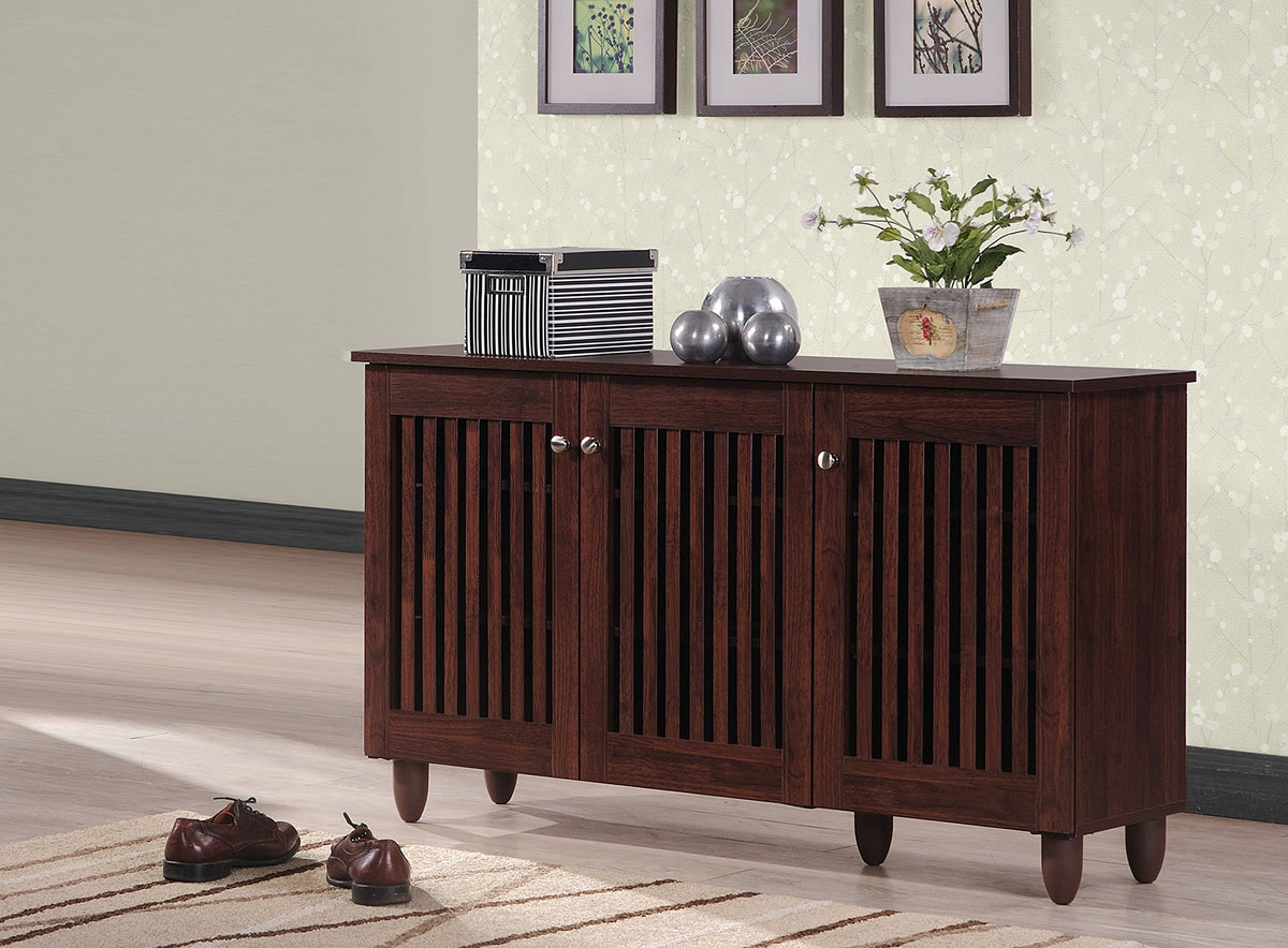 This smartly-designed shoe cabinet, from the esteemed house of Baxton Studio, does not occupy too much floor space as it is wide and spacious. Simple and elegant design make this one of those pieces of furniture that is easy to complement. Perfect for families and people how have a fetish for footwear, this shoe cabinet can accommodate up to twelve pairs of shoes in the wide cabinet with two of its fixed shelves behind each door. To match your modern and contemporary home decor, the doors come with silver handle pulls for your convenience. The slatted doors allow air circulation, which is essential for the storage of shoes helping to keep them mold free. Made in Malaysia, the shoe storage cabinet requires assembly. -Made of engineered wood -Has oak brown finish -Has four doors and six shelves on the 4-door unit; three bigger shelves and three smaller shelves in the 3-door unit -The door has metal handles for easy opening and closing -Doors have a magnetic closing system -Legs are made of PVC -Can hold up to 18 pairs of shoes in the 4-door cabinet and 12 pairs of shoes in the 3-door cabinet -Assembly required -Made in Malaysia -Overall dimension: 4-door cabinet- 48.62 "H X 30.24" W X 13.23"D; 3-door cabinet-26.57" H X 44.88"W X 13.23" D -Shipping dimension: 4-door cabinet - carton 1: 4X47X16--36lbs; carton 2: 5"X32"X15"--40lbs 3-door cabinet - 5X47X16--55lbs.