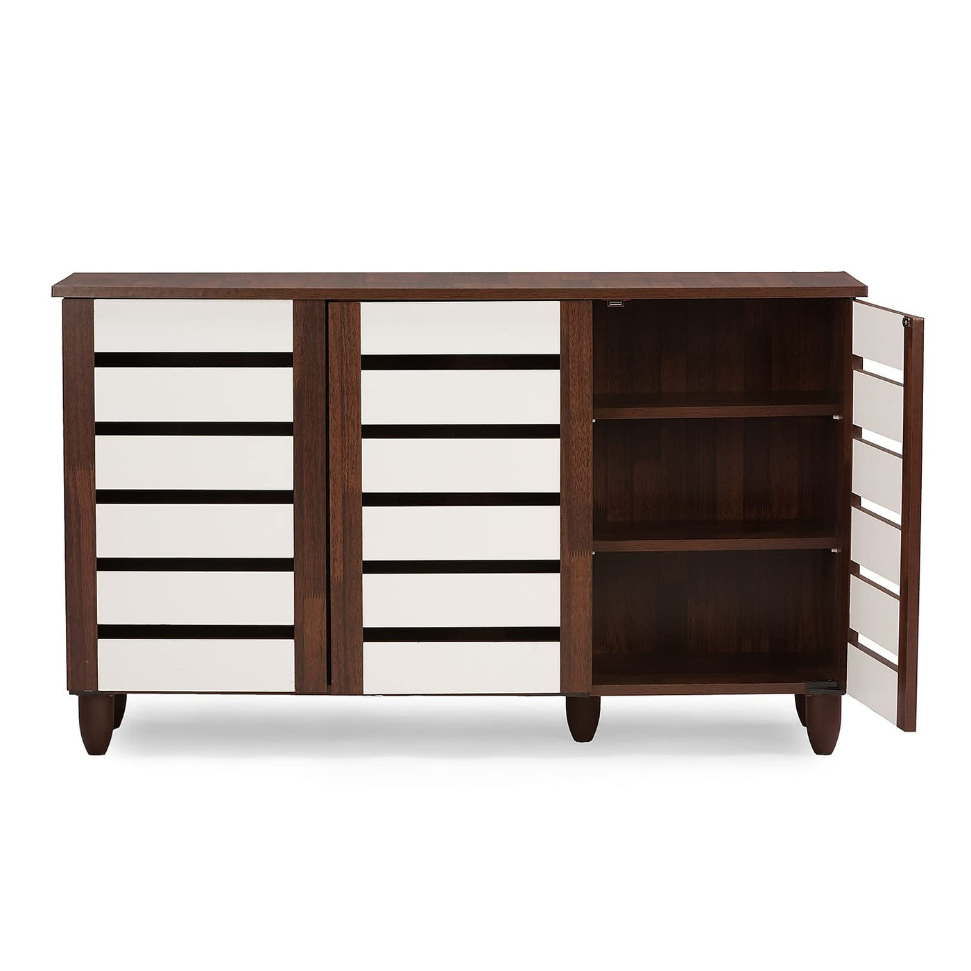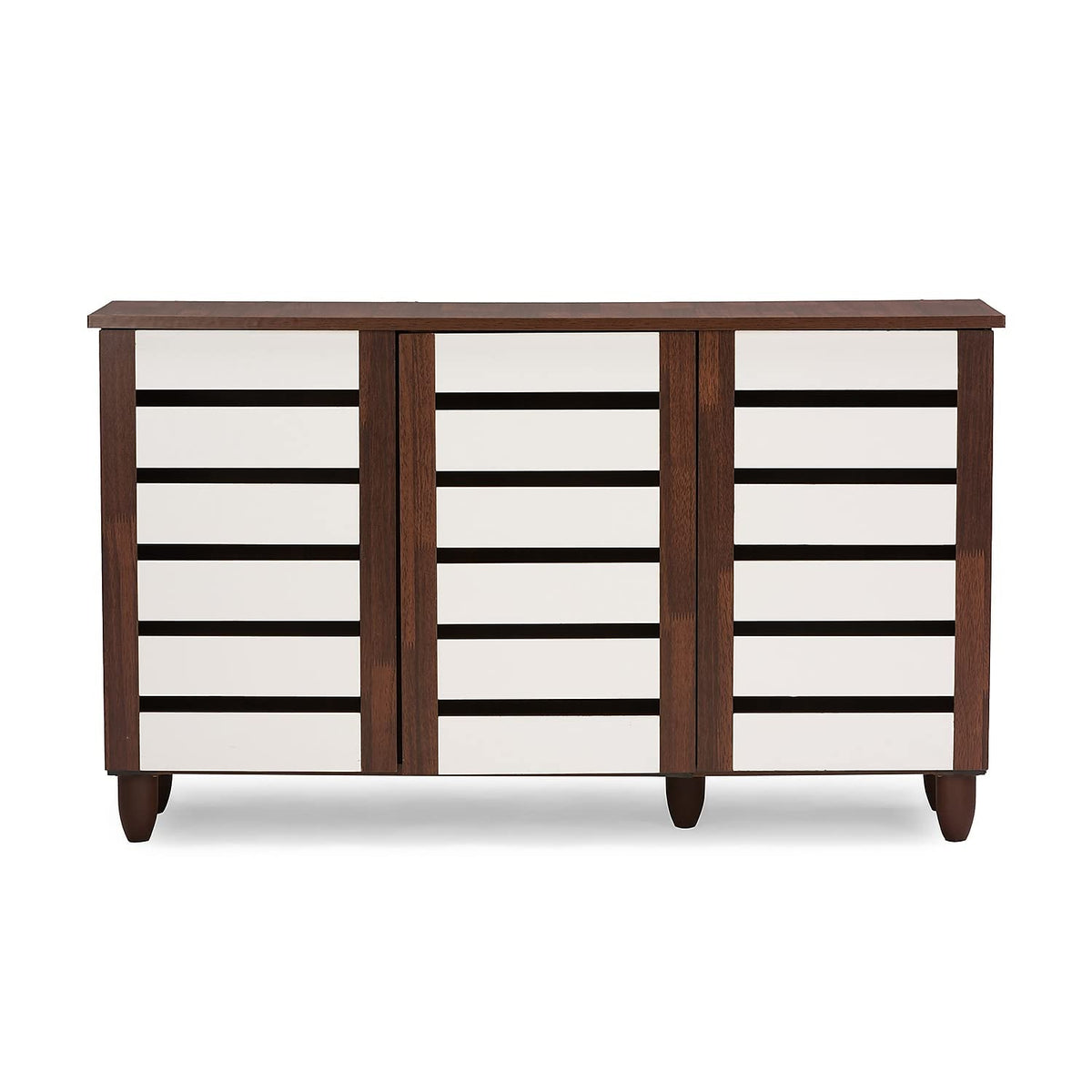 With a compact and elegant design, the Gisela series shoe cabinets from Baxton Studio is perfect for houses with space constraints. Two-tone finish for a modern look in dark oak and white will blend in with a variety of décor schemes easily. Functional and beautiful, it makes for a great addition to your home. The shoe cabinet is solidly built with engineered wood in two-tone oak and white finishing. The shoe cabinet has three shelves with two fixed dividers , three doors and vinyl legs. Made in Malaysia, the Gisela shoe cabinet requires assembly.