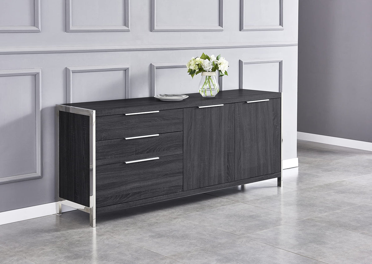 The Carter 3-drawer, 2-door Lacquer Cabinet is a modern storage solution with a unique design. Featuring three spacious drawers and two doors with ample storage space and study shelves, this cabinet is as beautiful as it is functional. A walnut paper wrapped lacquer finish is accented with stainless steel handles and legs, adding to the sophisticated modern aesthetic. Features: Includes one 3-drawer, 2-door cabinet, and 4 total shelves Walnut lacquer finish Stainless steel handles and legs Dimension: 71 in. x 18 in. x 30 in. (L x W x H) Minimal assembly required Ships in several boxes, may ship separately
