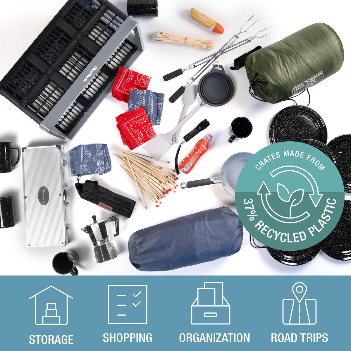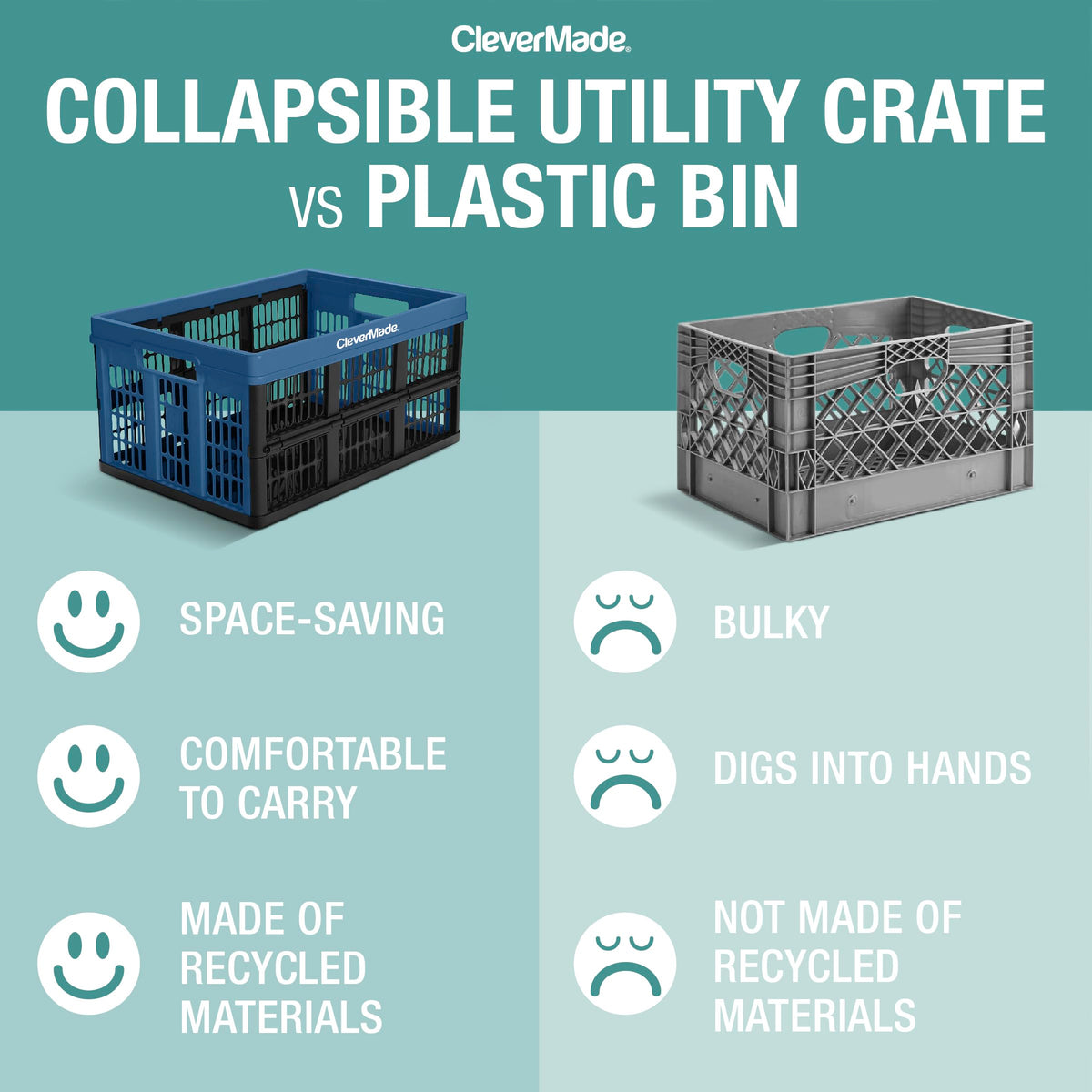 Q: Are these crates environmentally friendly?A: Yes, the CleverMade utility crates are made from 37% recycled plastic and 63% polypropylene regrind, making them an eco-friendly alternative to traditional plastic bags and cardboard boxes.