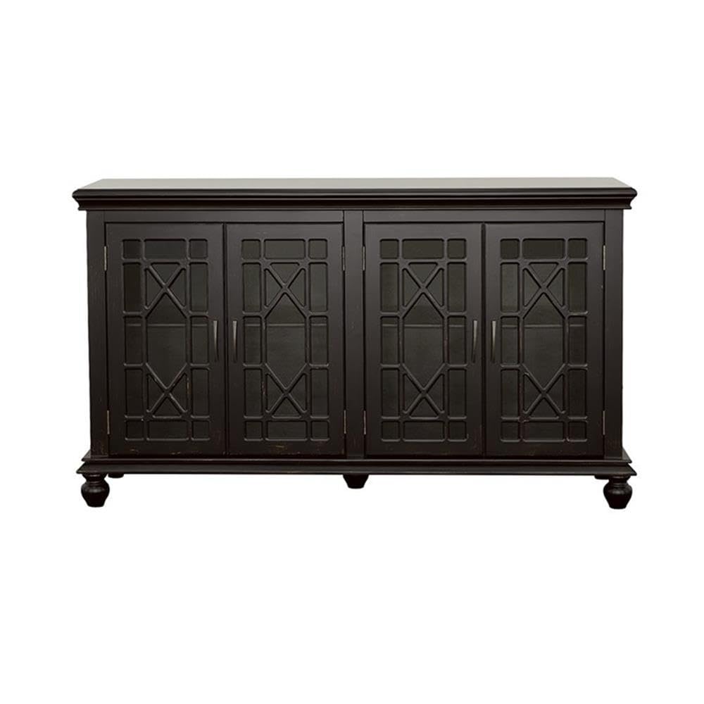 This Coaster Traditional Black Accent Cabinet with Lattice Doors measures 60" length, 15" width, 35" height. Store your best dishes behind glass doors with this four-door accent cabinet. While the glass doors provide a peek at what is inside, a well-designed wood overlay adds interest to the doors. Tulip feet support the cabinet and add a traditional touch. With the black finish, this cabinet goes well in a living or dining space.