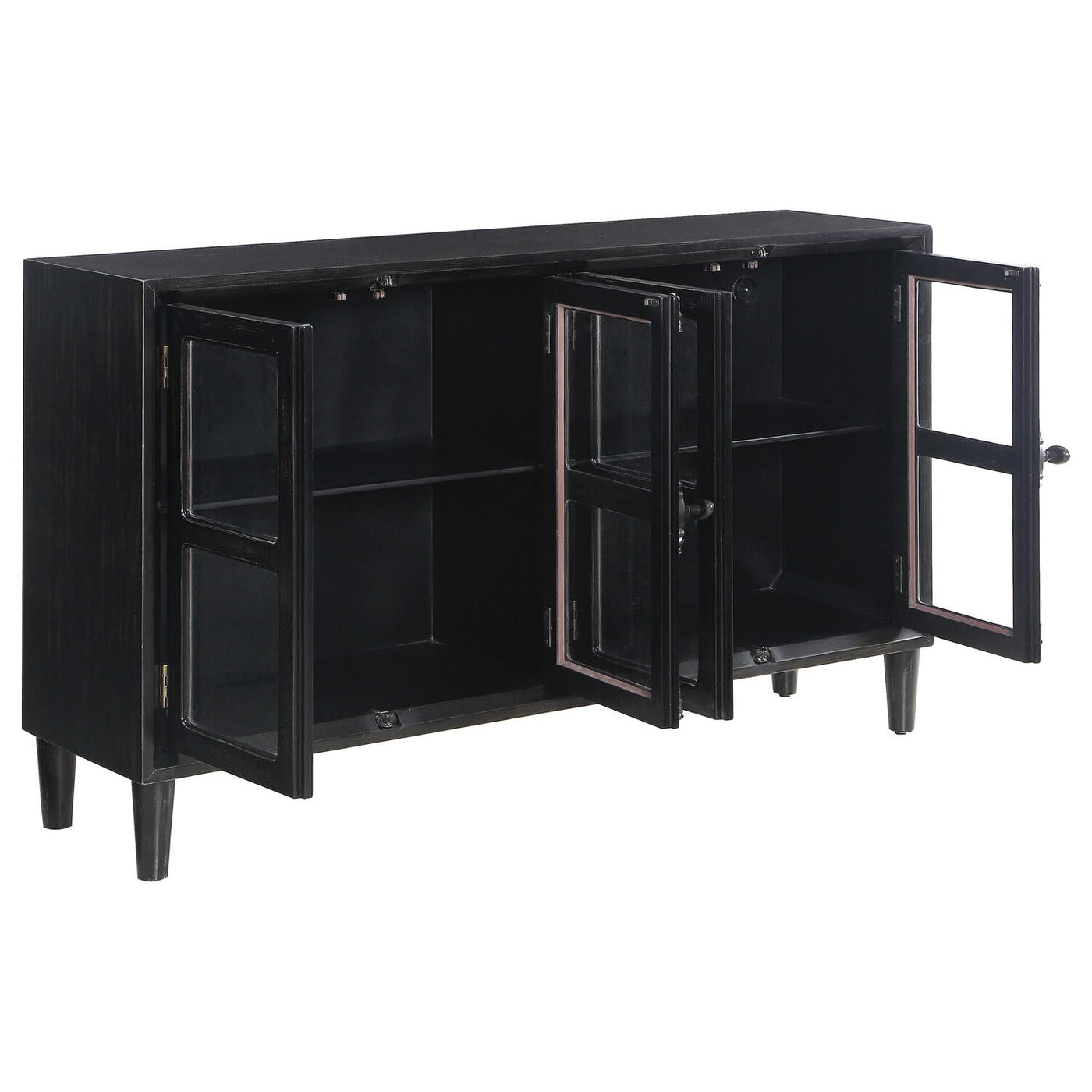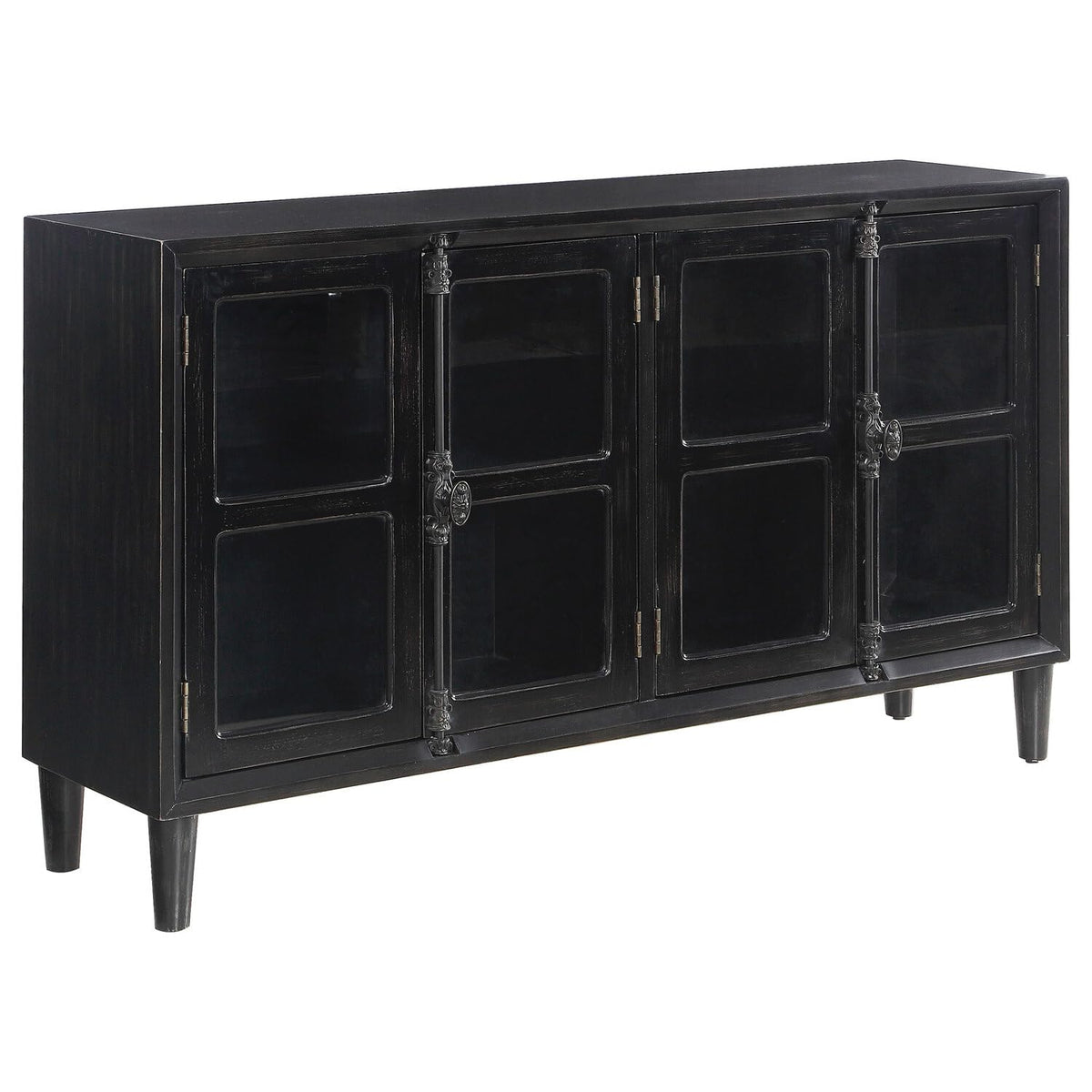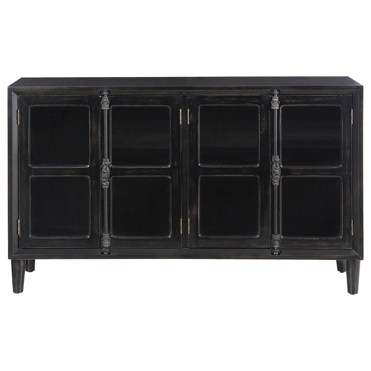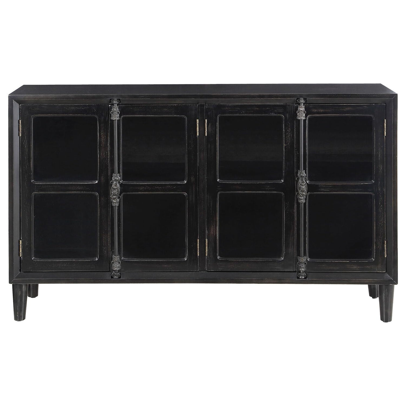 This Coaster Transitional Black Accent Cabinet with Glass Doors measures 60" length x 16" width x 36" height. If you're looking to bring an antique, French inspired design element into your home, look no further than this charming accent cabinet. With four doors with antique French door bolts, clear glass inlays, and hardware finished in black, this inspired piece encapsulates sophistication and elegance. With its square glass doors, this accent cabinet is a good choice for those with items they prefer to display.