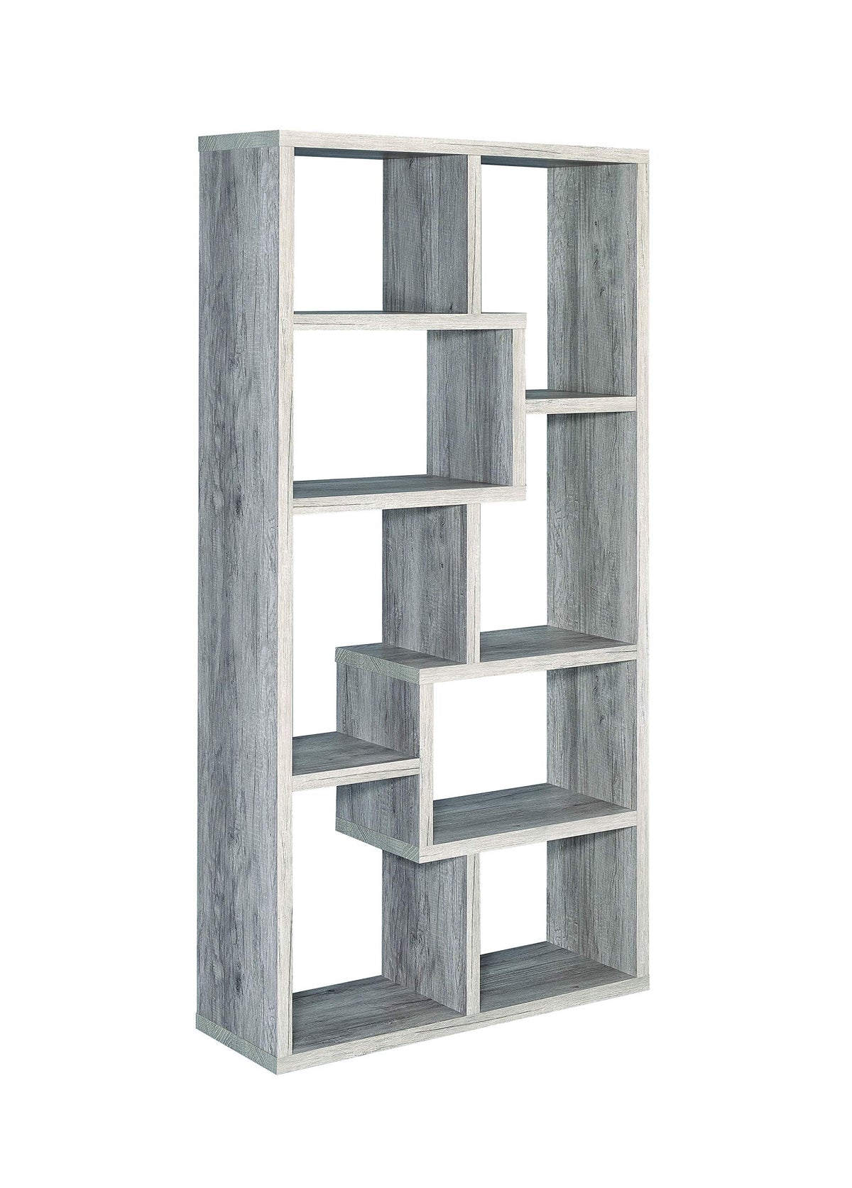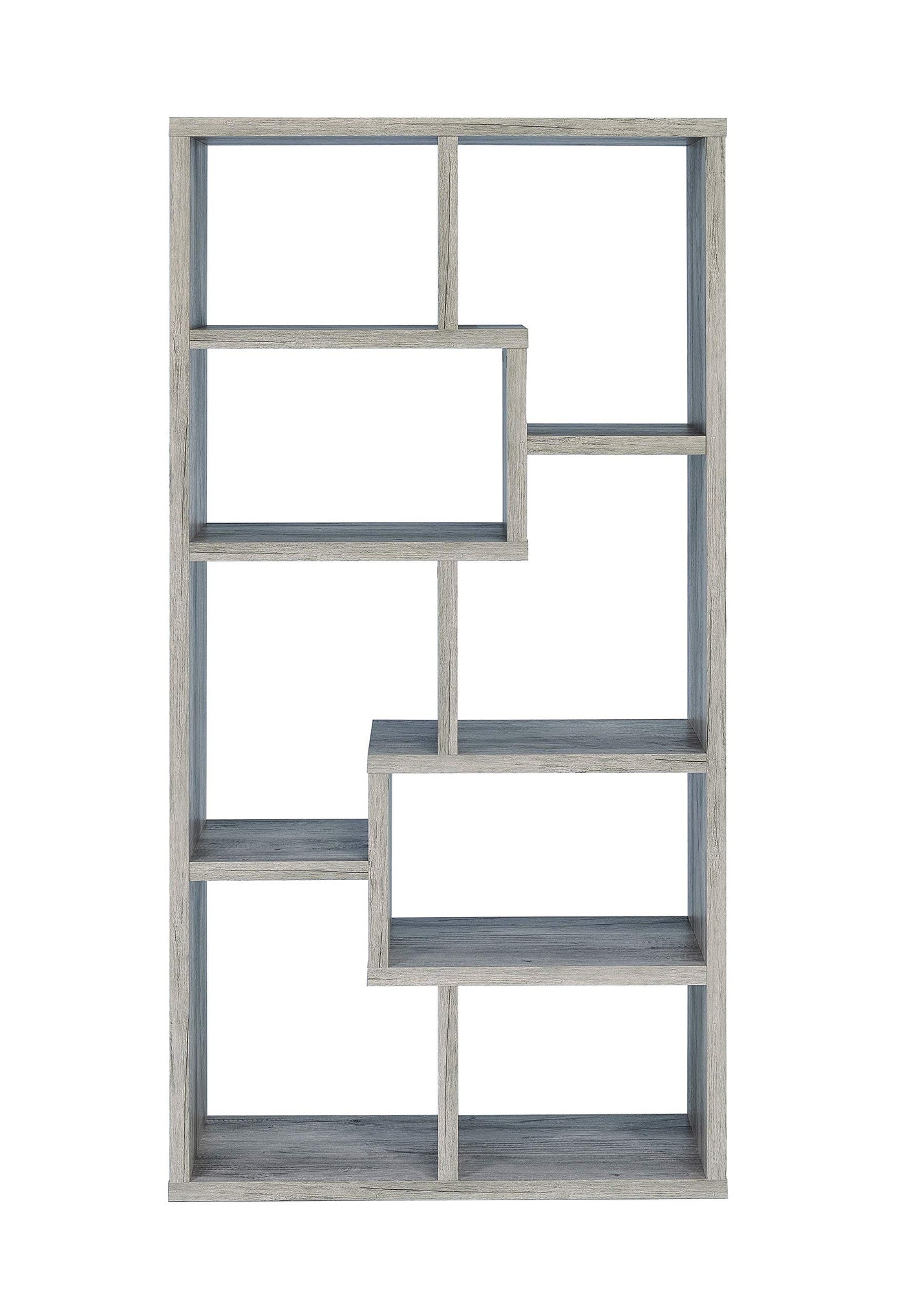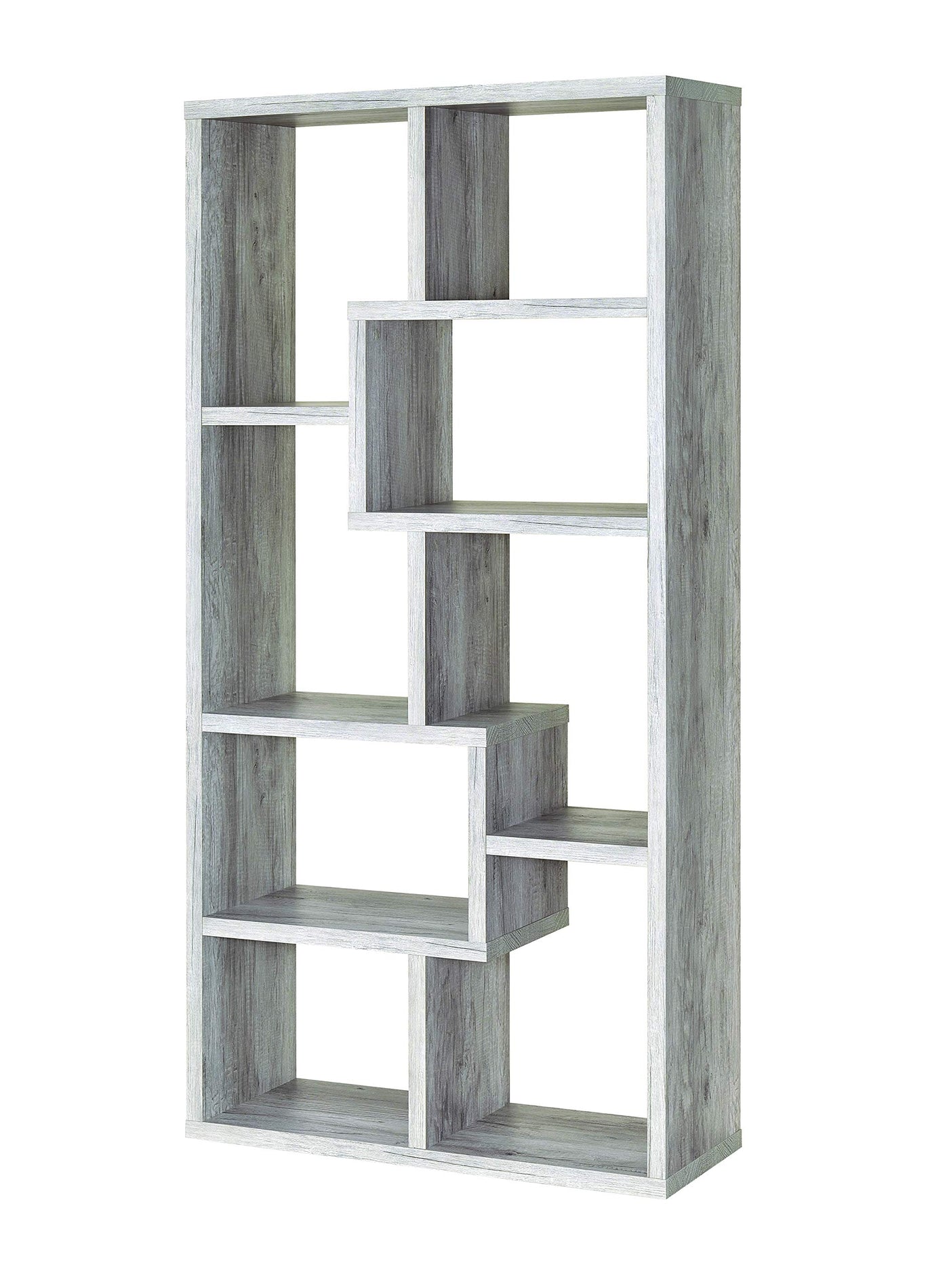 Stylize a modern space with a fashionable and functional piece. This gorgeous bookcase brings together the unmistakable beauty of geometric asymmetry. With a engineered veneer frame and modern design, it adds an elegant simplicity. Display books, decor, and photographs on multiple fun storage partitions. This exquisite bookcase adds a gentle, soft, and inspiring look to a contemporary room.