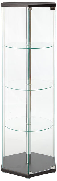 This Coaster Traditional Glass Hexagon Shaped Curio Cabinet with Three Round Shelves measures 24" length, 24" width, 63.5" height. Your collectibles and favorite accessories will get the display time they deserve with this curio cabinet. The hexagon-shaped curio has glass on all six sides so guests will be able to see all items you want to show off. Three glass shelves are anchored by one center pole, ensuring the stability and keeping your items safe and secure. The cabinet's black top and base are perfect complements to the design.