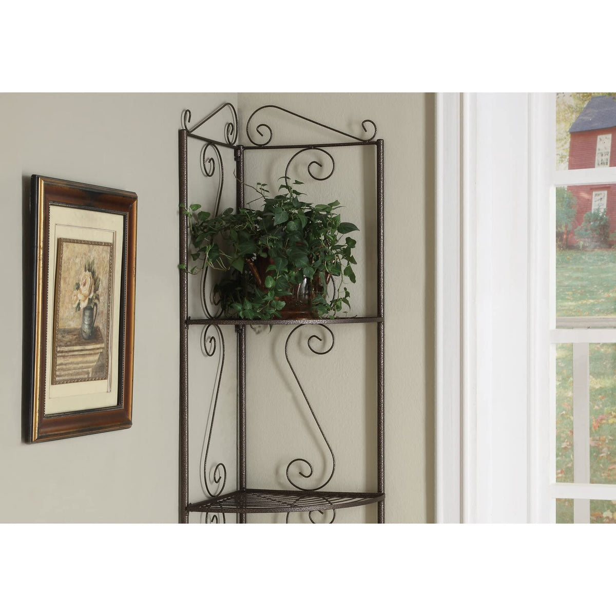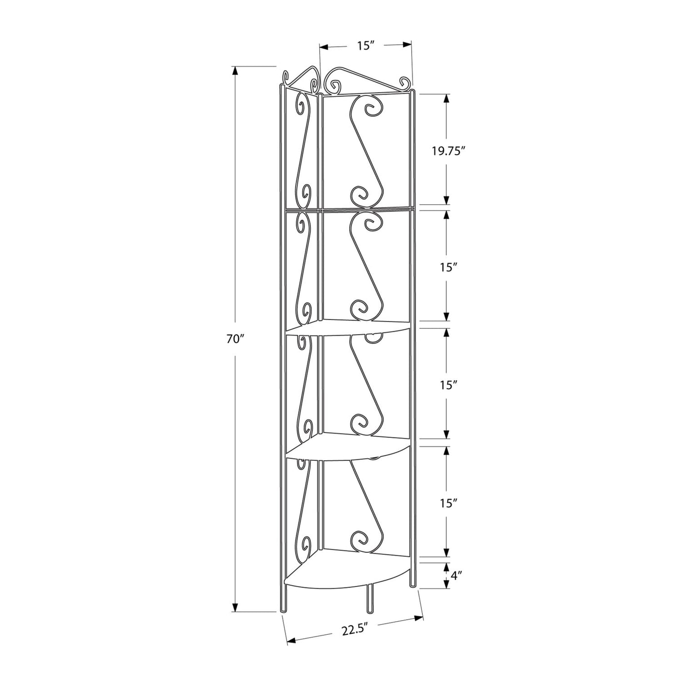 This corner bookcase creates a space-saving way to display accent décor and small books. Four tiers make room for candles, plants, and books. Constructed from steel, its lovely copper finish adds warmth and radiance in any room. Ornate scroll design elements add a fresh, stylish twist. This corner bookcase makes good use of typically empty space.