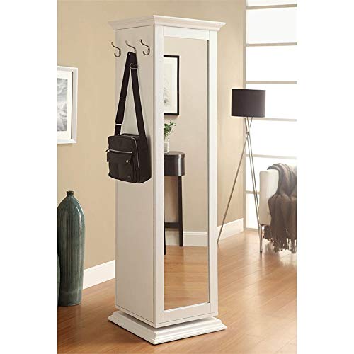 This curio accent cabinet offers function and style for an entertainment room or even spacious kitchen. It features five shelves for all your storage needs. It's also crafted with a convenient mirror and plenty of hooks to hang cups or knickknacks. It even has a corkboard for putting up photos and daily reminders. Finished in brilliant white, the cabinet swivels for convenience.