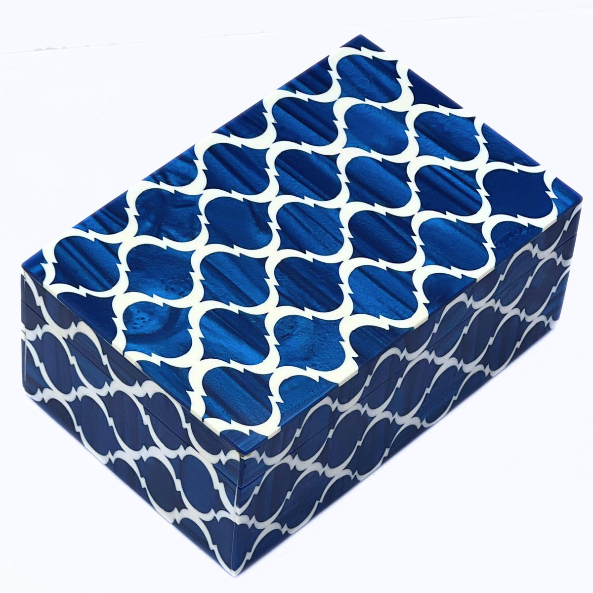 The Box Is Finished By Overlaying Of Bone Tiles And Filling Resin, Giving It A Smooth Finish. Classical Bold Blue Morroccan Design. Height:2.5'' Inches, Size:6'' X 4'' X 2.5'' Inches, Weight:350 Gram - Handmade Bone Inlay Boxes Premium Version Small Box For Home D Cor Blue Moroccan Premium Boxes, Storage Jewelry Containers Square Antique Designer. The Full Bone Inlay Design Box Blue Resin For Clam Look. The Bone Inlay Technique Is Applied With Delicate Craftsmanship To Design This Beautiful Ornament Or Makeup Box. An Artful Assortment Of Bone Tiles Gives The Product A Magnificent Look.