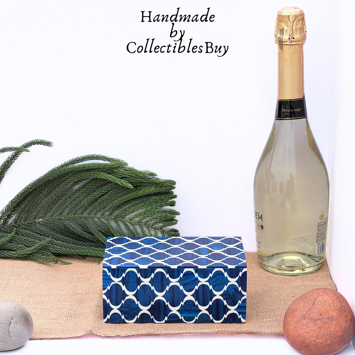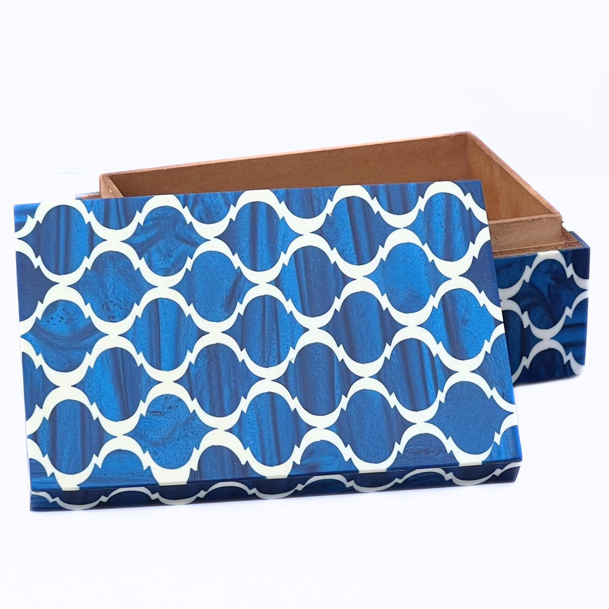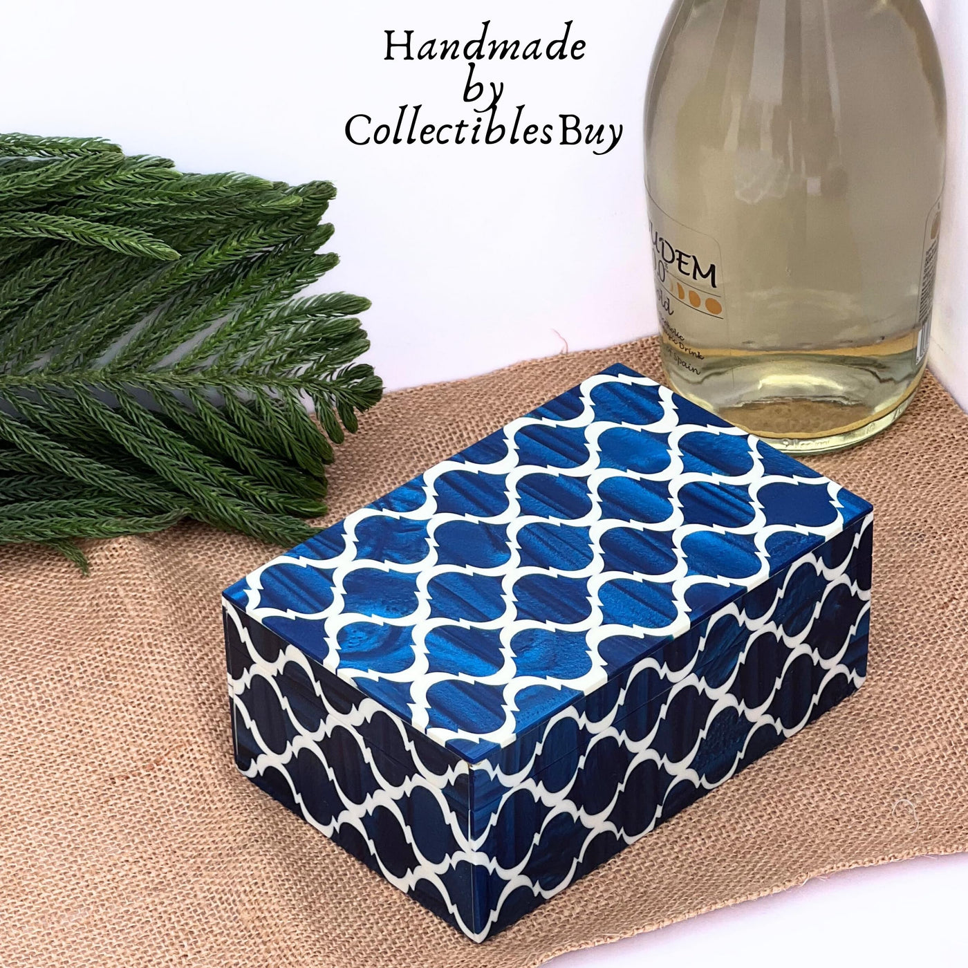 Q: What materials are used in the construction of the jewelry box?A: This jewelry box is handcrafted using blue and white resin on engineered wood, providing both durability and a beautiful aesthetic.