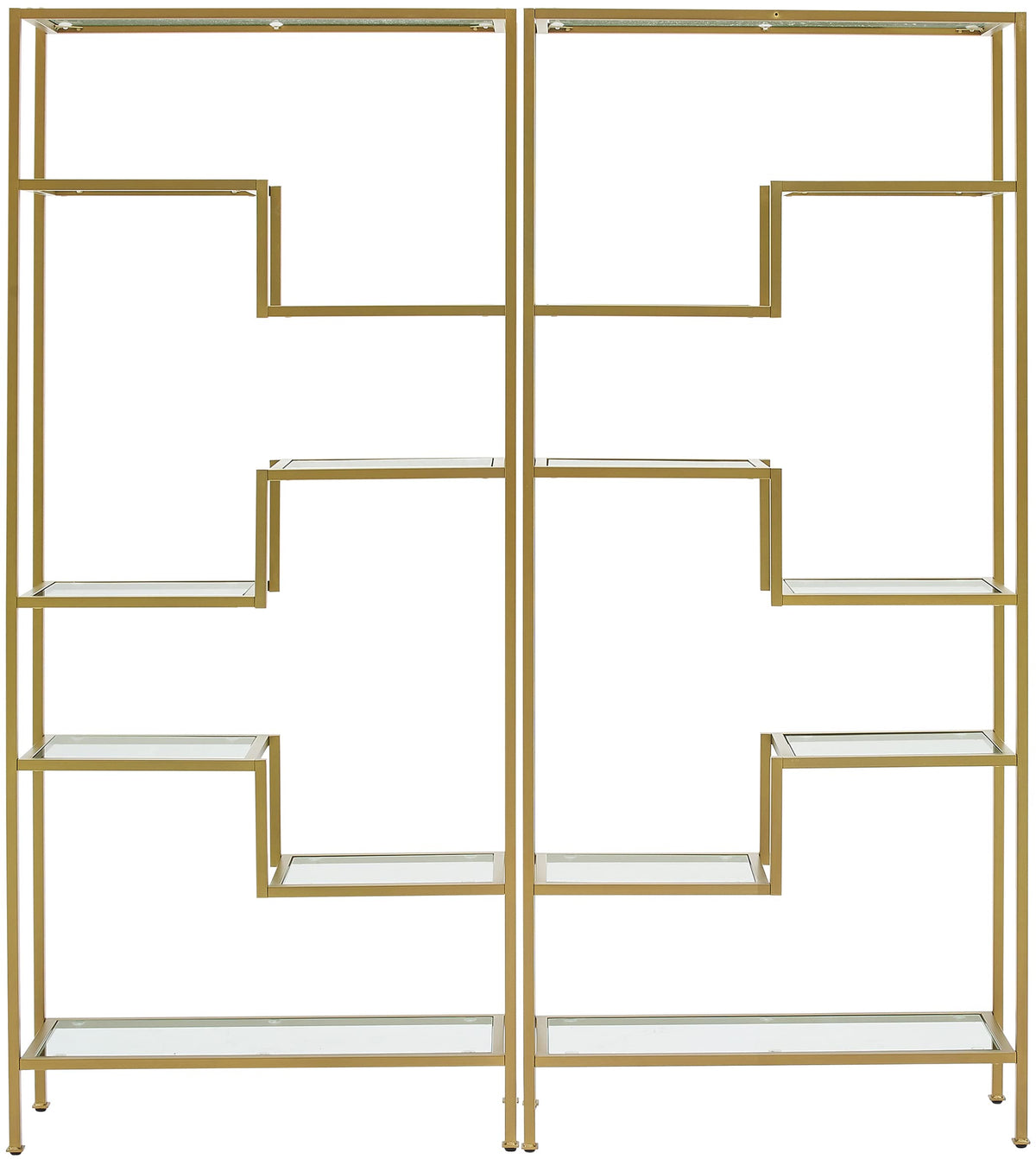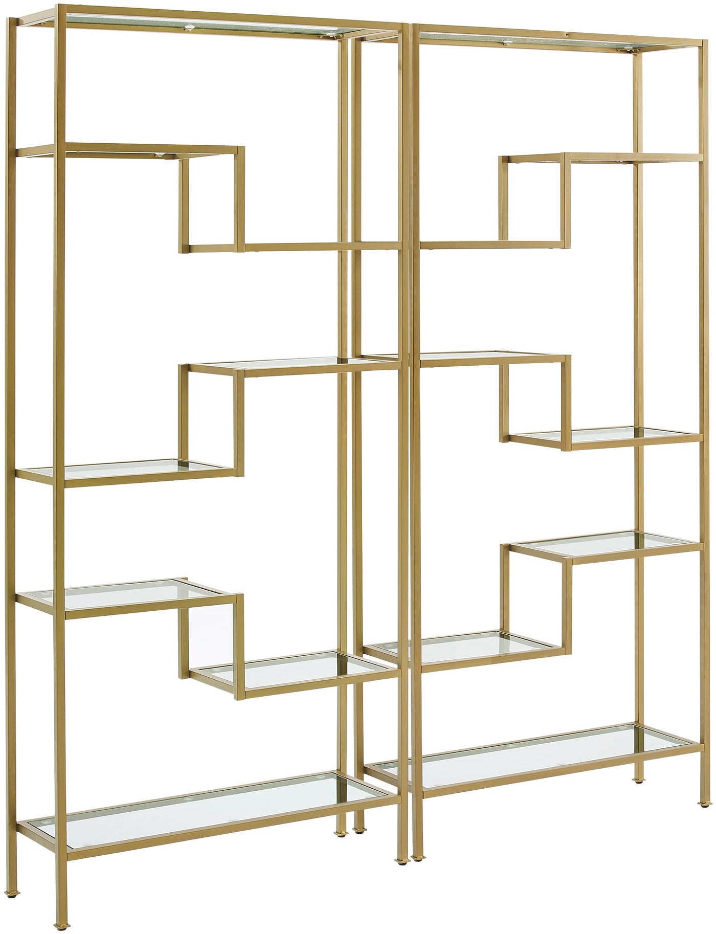 Modern beauty and functional simplicity are the hallmarks of the Sloane 2-Piece Etagere Set. Ready to display precious keepsakes or your favorite books, this etagere set's sculptural steel frame features sturdy tempered glass shelves. With variable shelf heights in an Art Deco design, the Sloane Etagere Set is sure to be the focal point of your living room or home office.