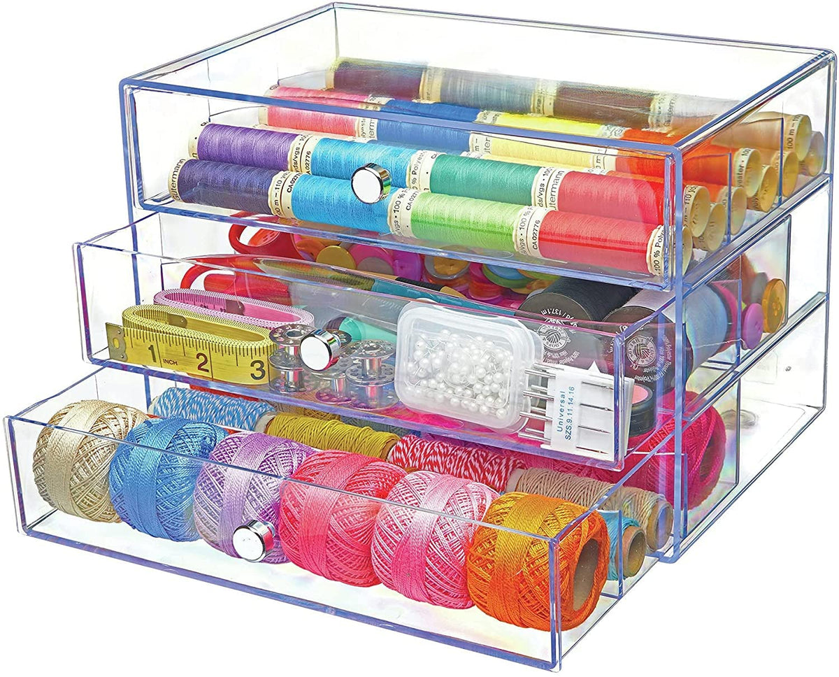 Three-drawer organizer features a transparent construction to provide full visibility of your supplies. Divided drawers keep your stored items neat and tidy. Compact, stackable design leave plenty of room on your work space. Nonskid pads on the bottom of the organizer protect your desk from scuffs and scratches. Organizer is perfect for storing tape, spools of thread, yarn, ribbons, small supplies and more.
