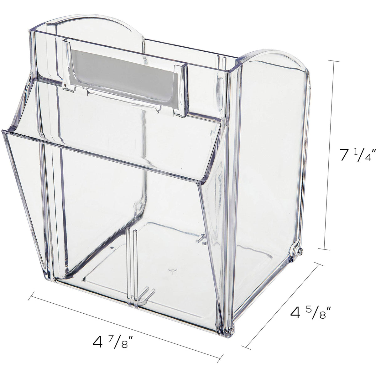 Modular unit with white frame and four clear bins features a unique interlocking design that lets you mix, match and stack different sizes. Mount bin storage system to a wall or place on a countertop. Bins tilt out, stay open and then close again with the touch of a finger. Each bin can be easily removed from locking mechanism for easy cleaning or refilling. Tilt Bin Storage System includes mounting hardware and identification labels.