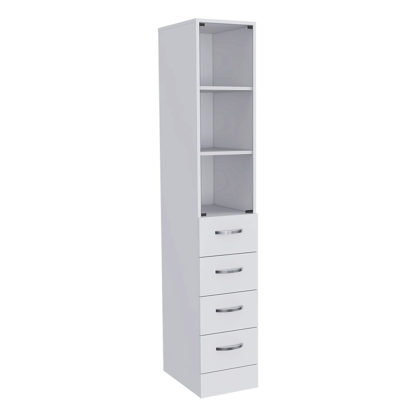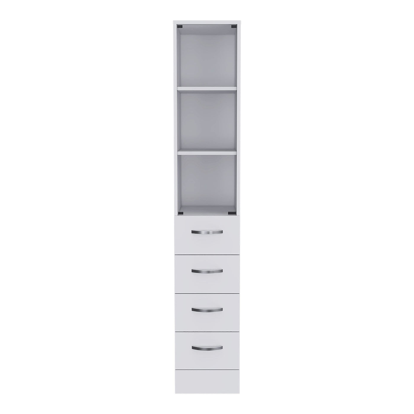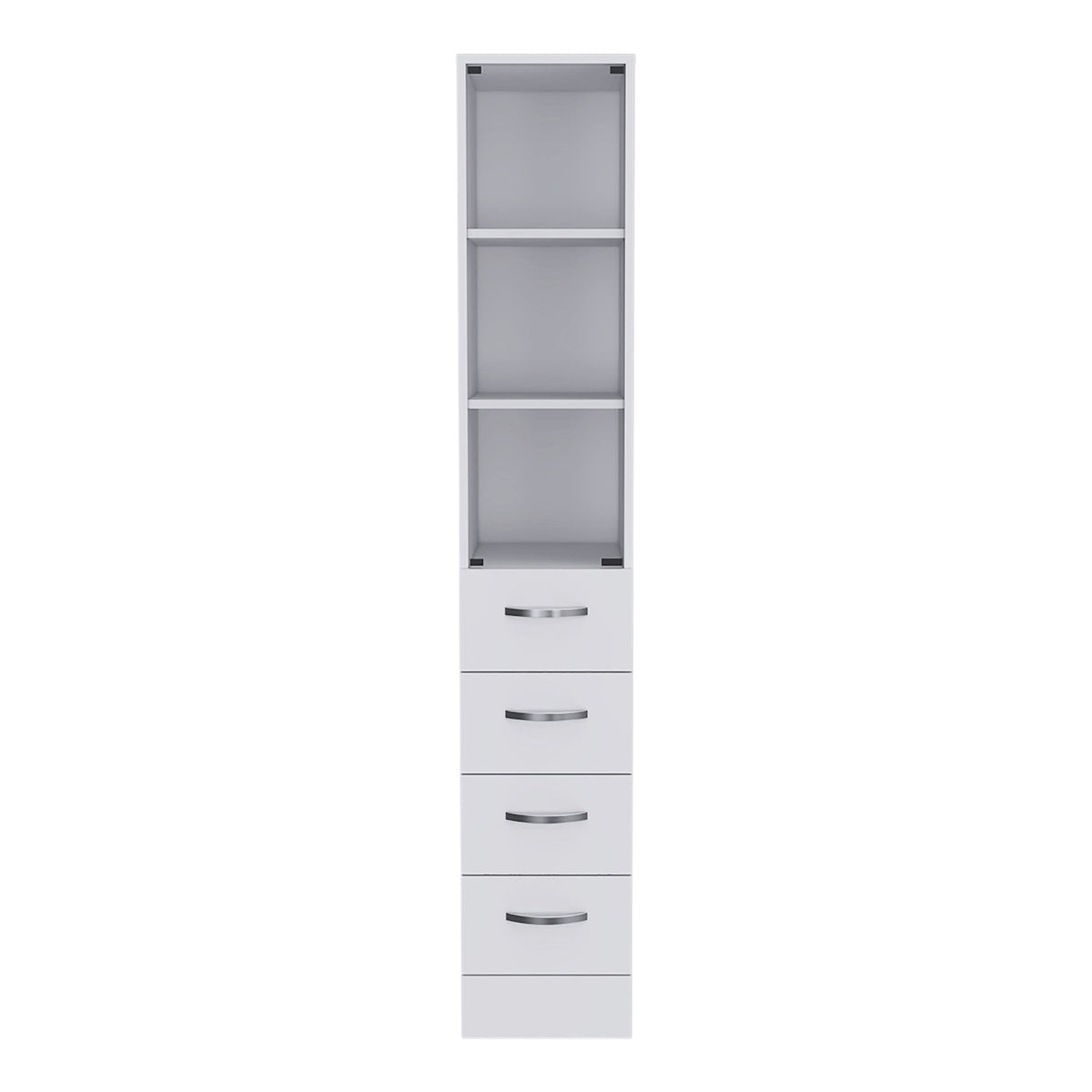 The Magna Linen Cabinet is designed to maximize your bathroom storage needs. This elegant cabinet features three open shelves ideal for towels and toiletries, and four spacious drawers for additional storage. Made from high-quality engineered wood, it is sturdy and durable, perfect for rooms with limited space. Easy to assemble, this cabinet is finished in an elegant white manufactured wood, enhancing any room's decor. Dimensions: Height: 68.2" Width: 11.9" Depth: 17.5" Furniture Type: Ready to assemble (full assembly required). Certifications: CARB phase II compliant – TSCA Title VI Compliant. Warranty: 1-year warranty coverage on wooden parts and hardware from the manufacturing date found on the product box.