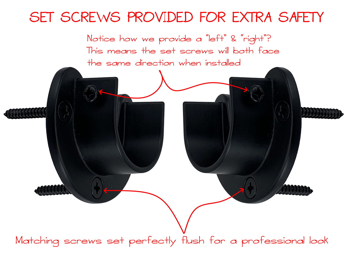 The Perfect Companion To Our Matte Black Closet Rod!If You'Ve Purchased A Desunia Closet Rod And Are Looking For End Supports, You'Ve Come To The Right Place! Made Of Cast Metal, These End Supports Have The Same Matte Black Finish As Our Closet Rods And Will Keep Looking Great For Years To Come.Set Screws Includedusually, Gravity Is Enough To Keep The Rod In Place, But If You Have Kids, Or Are Just Looking For A Bit More Security, They'Re Sure Nice To Have. Also, Unlike Other Manufacturers, We Provide A Left & Right. This Means Both Set Screws Will Be Facing The Same Direction After They'Re Installed, For A Clean Look. Installation Hardware Includedgotta Say, We Really Did Go The Extra Mile Here! We Provide You With Two Different Length Screws... Just In Case. Use The 1 1/8'' Screws When Going Into Drywall (We Provide The Drywall Anchors Too Btw), But If You'Re Just Going Into A 3/4'' Thick Wood Panel, You Can Opt To Use The Shorter Screws That We Also Provide. They'Re Phillips Head #7 And Sit Nice And Flush In The Flange For A Really Professional Look.Here'S What You Get- 2 Cast Metal Matte Black End Cups (For Any Rod Up To Diameter- 6 Phillips Head Screws (1 1/8'' Long)- 6 Phillips Head Screws (3/4'' Long)- 6 Hollow Wall Anchors