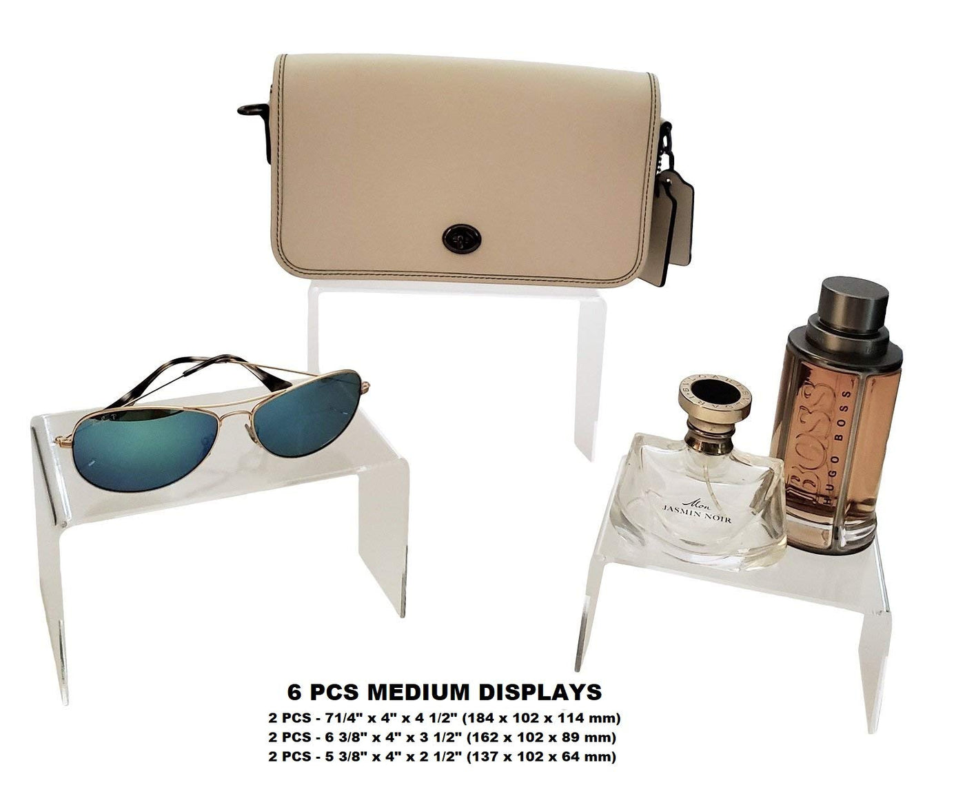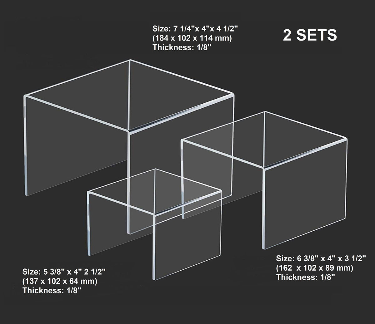 This Perfect Combination Acrylic Display Risers Help To Organized Countertops With Eye-Catching Display, Plastic Risers Help To Organized And Drive Focus To The Items Of Your Choosing. Take Your Precious Store Goods To New Heights And Help Move More Merchandise. Measurements: Two 7 1/4'' X 4'' X 4 1/2'' (184 X 102 X 114Mm) Two 6 3/8'' X 4'' X 3 1/2'' (162 X 102 X 89Mm) And Two 5 3/8'' X 4'' X 2 1/2'' (137 X 102 X 64Mm)