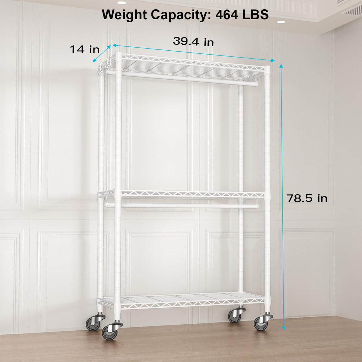 Q: How much weight can this garment rack hold?A: This heavy-duty garment rack can support a maximum load of 464 pounds, making it suitable for storing a variety of clothing items and accessories.