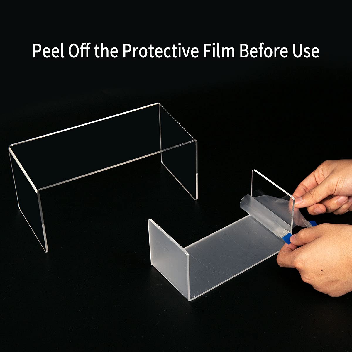 Q: Do the risers come with any protective features?A: Each acrylic riser stand comes with a protective film on both sides to prevent scratching during shipping. Make sure to peel off the film before use to enjoy the full clarity and shine of the acrylic.