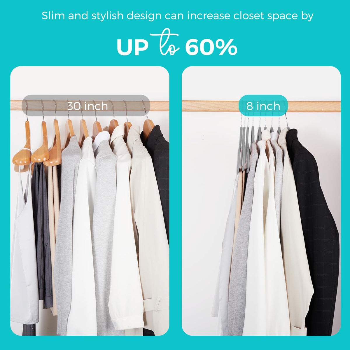 Q: Can these hangers help save space in my wardrobe?A: Yes, the ultra-thin design of each hanger maximizes storage space and can increase closet space by up to 75 percent, helping you keep your wardrobe clutter-free.