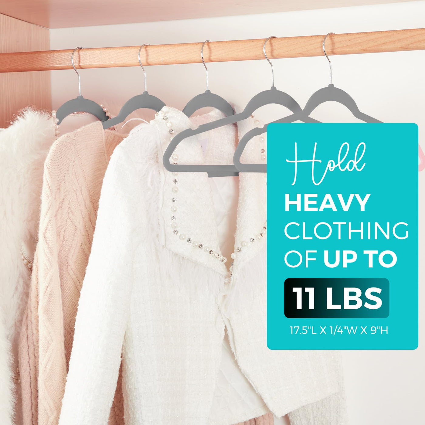 Q: How much weight can each hanger hold?A: Each hanger can steadily hold heavy clothing of up to 11lbs, making them suitable for coats, suits, long skirts, shirts, and more.
