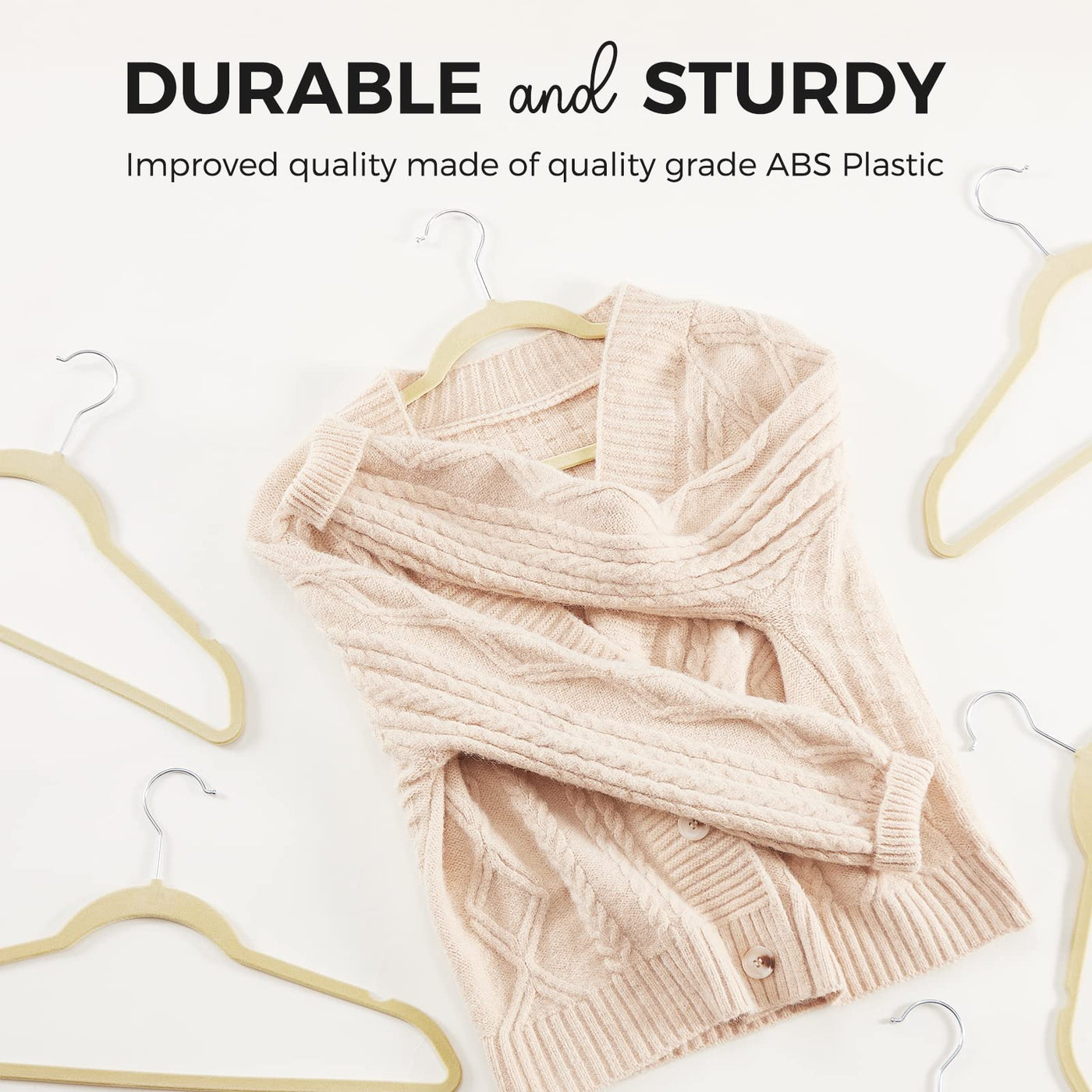 Q: What materials are used in HOUSE DAY Premium Velvet Hangers?A: The HOUSE DAY Premium Velvet Hangers are crafted from high standard grade ABS Plastic, enhanced over time for durability. They feature a soft and luxurious velvet surface that is gentle on clothing, preventing deformation and wrinkles.