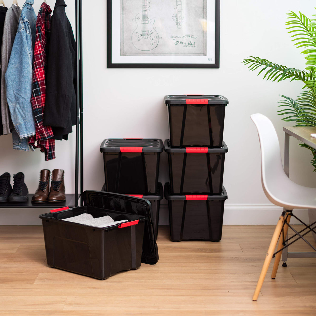 Q: Can I stack these bins and how do they secure together?A: Yes, these storage bins are designed to be stackable. The securely locking lid ensures that the bins can be safely stacked on top of each other without risk of tipping over.