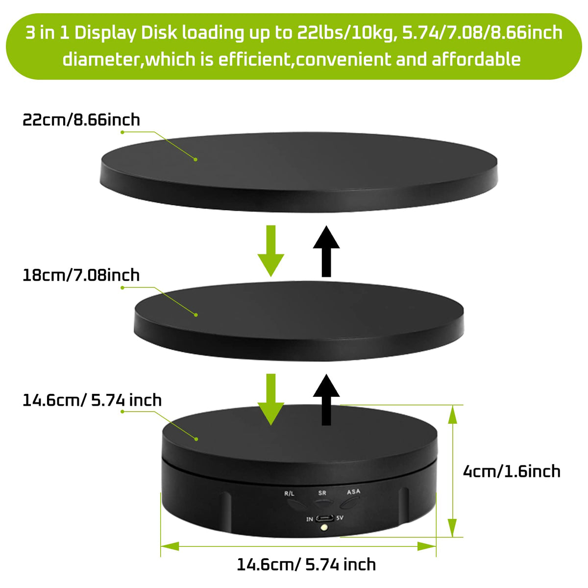 Product Description : Item Size:5.74 X 1.97 Inches Net Weight: 0.6 Kg / 1.3 Lbs Maximum Load: 22 Lbs (10 Kg) Material: Abs+Motor+Pcba Package Include: 5.74 Inch Turntable * 1 Pcs 7.08 Inch Replacement Cover * 1 Pcs 8.66 Inch Replacement Cover * 1 Pcs User Manual * 1 Pcs Built In Rechargeable Battery In The Turntable