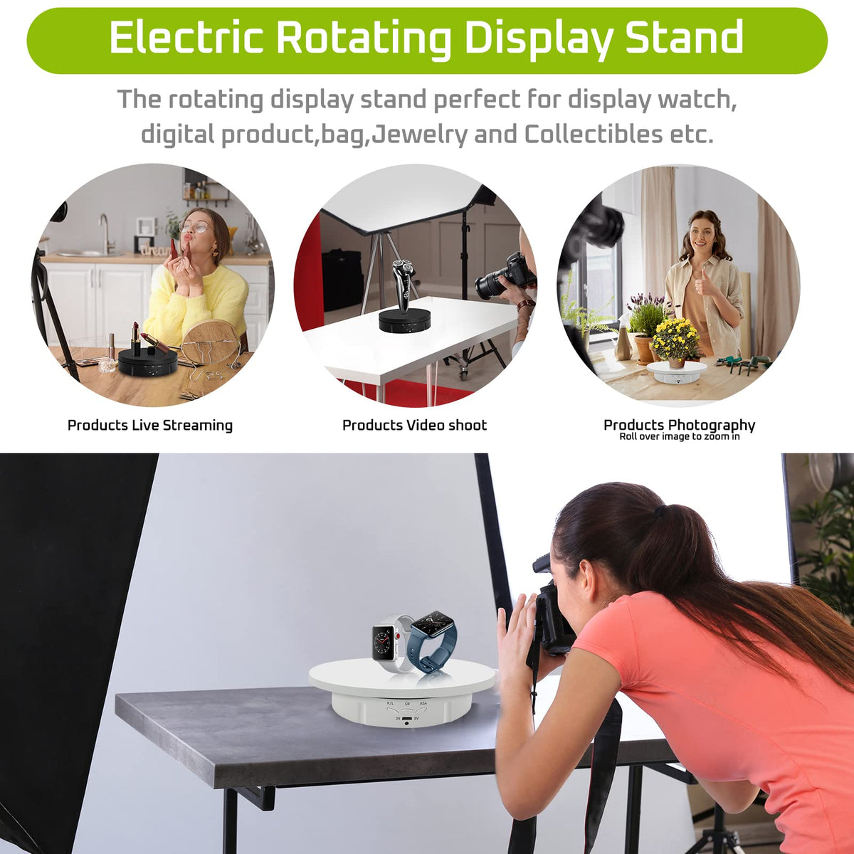 Q: How does the motorized rotation feature work?A: The stand features a motor that allows for 360-degree rotation, with adjustable speed and direction. You can choose between clockwise or counterclockwise rotation, and set the speed to 1-2 revolutions per minute.