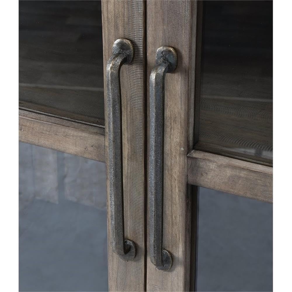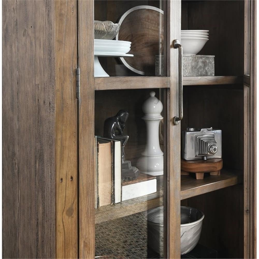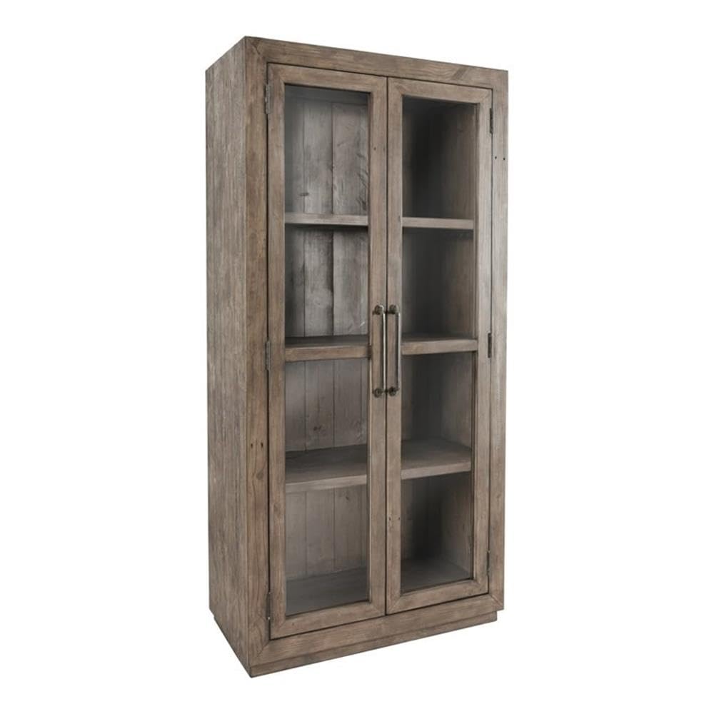 Solidly constructed from reclaimed pine wood, this display cabinet offers four shelves to perfectly showcase collections of books, framed photographs, or trophies and awards. A neutral finish with gray and brown tones suit any color scheme while the clean, classic lines complement any style of home or office.Features:Materials: Reclaimed pine distressedFinish: Weathered brownPlastic footpad includedHand Finished and DistressedDust surfaces with a feather duster and wipe gently with a slightly damp cloth/chamois. Be sure to wipe any spills immediately; use coasters to protect surface from liquids.Do not place furniture in close proximity to heating outlets or direct sunlight.DO NOT USE: Silicone based polishes/cleaners; solvents; abrasives.Specifications:Product Dimensions: 70"H x 35"W x 17"DProduct Weight: 151 lbsProduct Dimensions: (Base) 1.6"H x 33.85"W x 16.3"DShelf Dimensions: 1"H x 31.3"W x 14"D; (Interior shelf) 15.24"H x 31.3"W x 14"DNumber of Shelves: 3Number of Doors: 2Warranty: 1 monthWarranty Description: (Term) Product defects onlyWarranty Description: (Additional warning or disclaimers) There are elements of distress, such as natural cracks, knots, indentations and other artificial imperfections that can be found in the details.