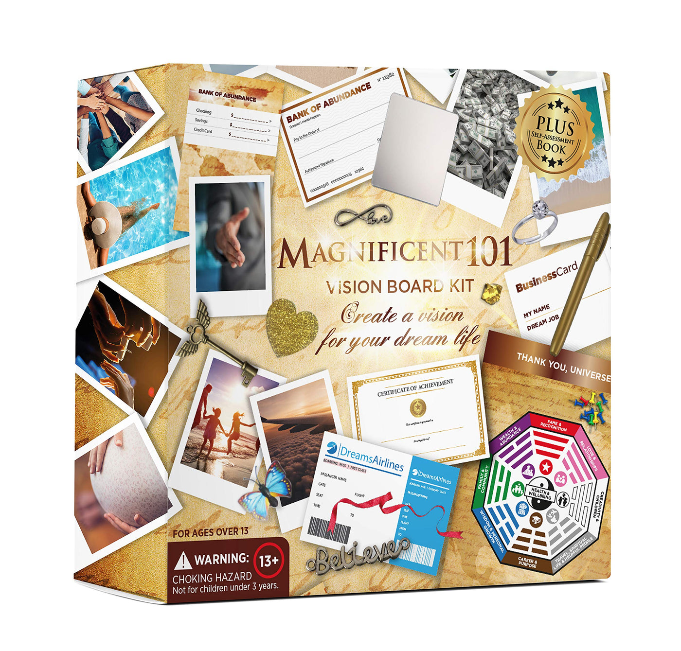 Create A Large Vision Board (23X17'') That Displays Your Personal Success Vision. Place It In A Space Where You See It Often And You Will End Up Doing Visualization Exercises Every Day. This Is A Proven Practical Tool To Immediately Start Using The Law Of Attraction In Your Favor. Holds Professional Vision Board Supplies Such As Fill In The Blank Intention Cards, Gratitude Cards, A Blank Check, A Blank Bank Statement, An Achievement Award, Life-Goals Pictures Designed To Generate Emotions Of Having Achieved These Goals, 8 Charms To Carry In Order To Speed Up Manifestation, And Many Vision Board Supplies More! Includes Thumb Tacks. The Bonus Item Is A Self-Assessment Book Designed As A Practical Guide To Shift Negative Beliefs And Immediately Start Using The Law Of Attraction In Your Favor. Welcome Growth And Personal Transformation! Magnificent101 Aims To Create Abundance Mindsets In Order To Create Positive Change In The World. Love, Light And Positive Energy Go Into Every Vision Board Kit.