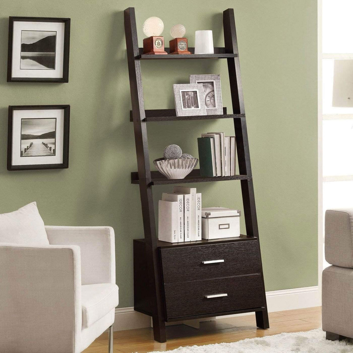 Who can resist this 69" high ladder style bookcase? The four graduating open shelves provide ample room to display pictures, decorative pieces, or books with tipping hardware included for further stability when placed against a wall. Two convenient storage drawers accented with sleek silver metal handles adds even more space to put away accessories within easy reach. A contemporary design in a rich cappuccino finish, the exquisite symmetry of this ladder bookcase adds style to a living room, home office, or hallway.