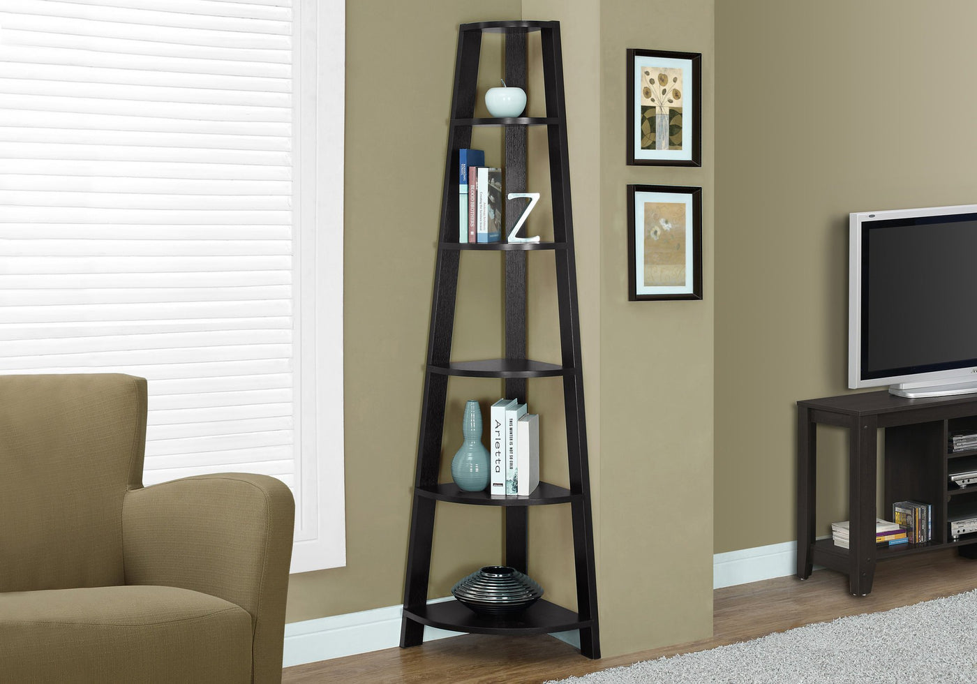 Add the perfect corner piece to any room with this sophisticated cappuccino accent étagère complete with five fixed tray style shelves. This contemporary/transitional designed bookcase blends well with any type of décor, providing additional display space without sacrificing style. Use it in a corner of your living room, family room, guest room, home office, or hallway for a tidy way to store your books and showcase your accent pieces. Tipping hardware is included for further stability.