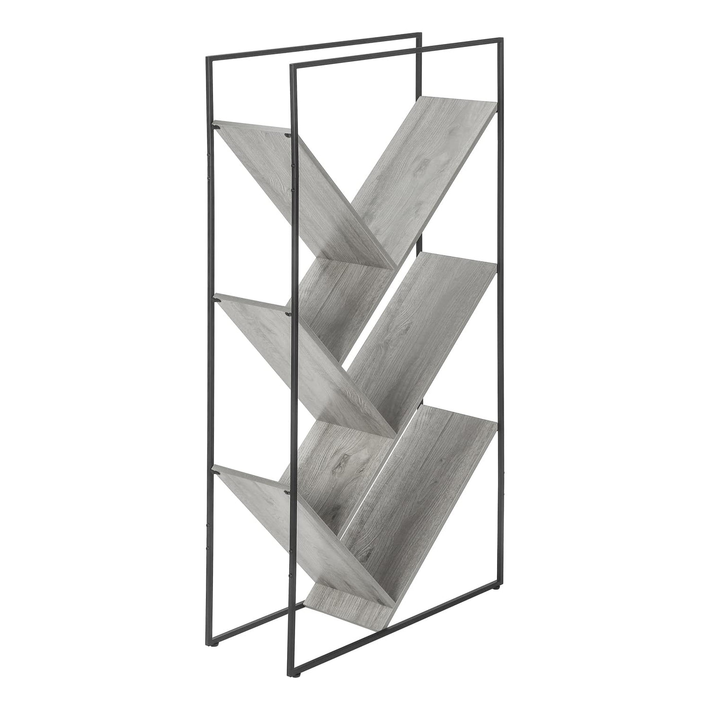 Look At Storage From A Different Angle With This Unique Bookcase. Slanted Shelves In A Smooth, Grey Wood-Look Finish Create Eye-Catching Geometric Angles That Form V-Shaped Display Areas In Different Sizes. The Sleek Shelving, Supported By A Black Metal Frame, Give This 5-Tier Bookshelf A Trendy Urban Style. Finished On All Sides, This Striking Etagere With Open Shelves Will Become The Center Of Attention In Any Room.