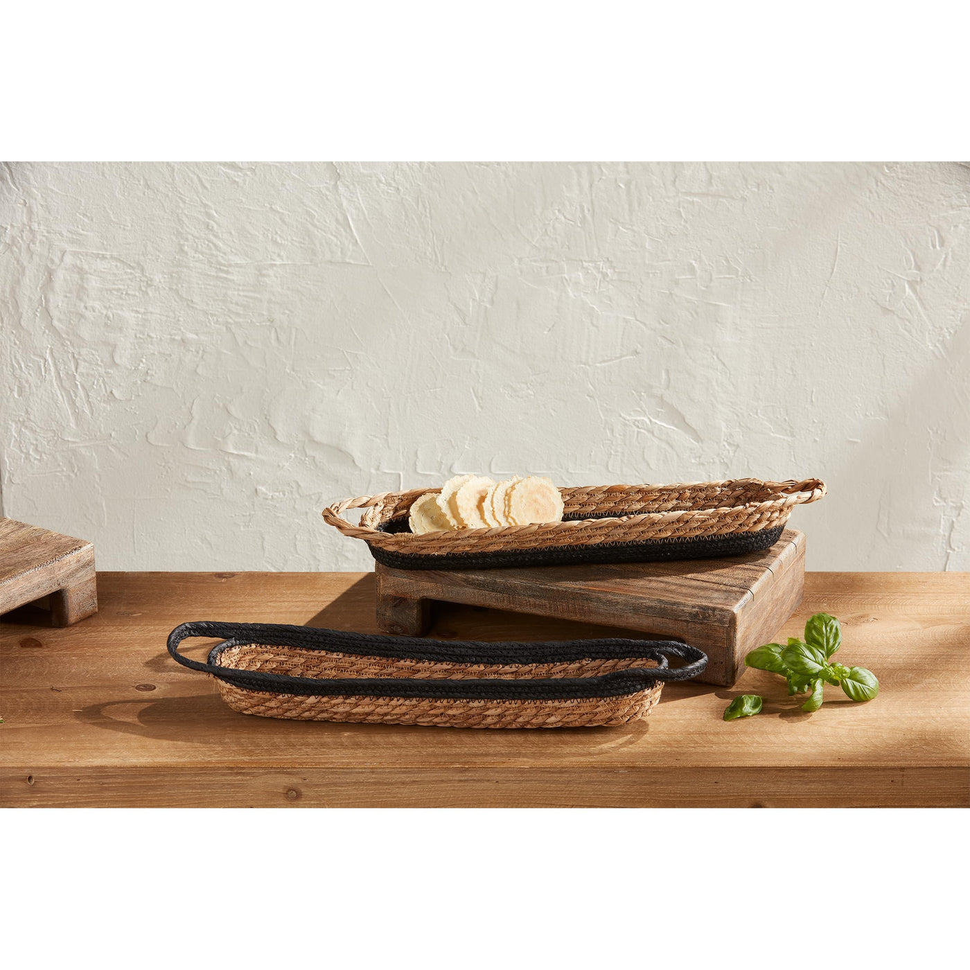 Q: What materials are the Mud Pie Nested Cracker Baskets made from?A: The Mud Pie Nested Cracker Baskets are crafted from beautifully woven two-tone seagrass, which adds a rustic charm to your table setting.