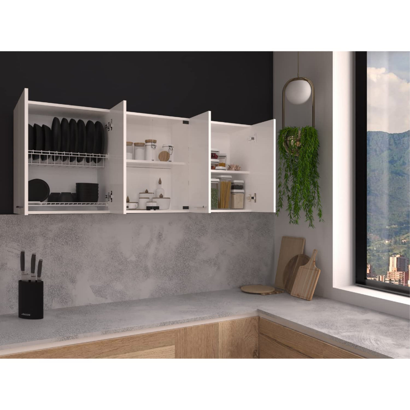 The Oceana 150 Wall Double Door Cabinet in White is the perfect solution for your kitchen storage needs. This modern cabinet features four doors with metal handles, separated by a central glass-covered shelf area, offering ample space for dishes, plates, cups, and small appliances. The built-in dish rack ensures your plates are neatly stored. With its elegant design and functional storage options, the Oceana 150 adds both style and practicality to your kitchen.