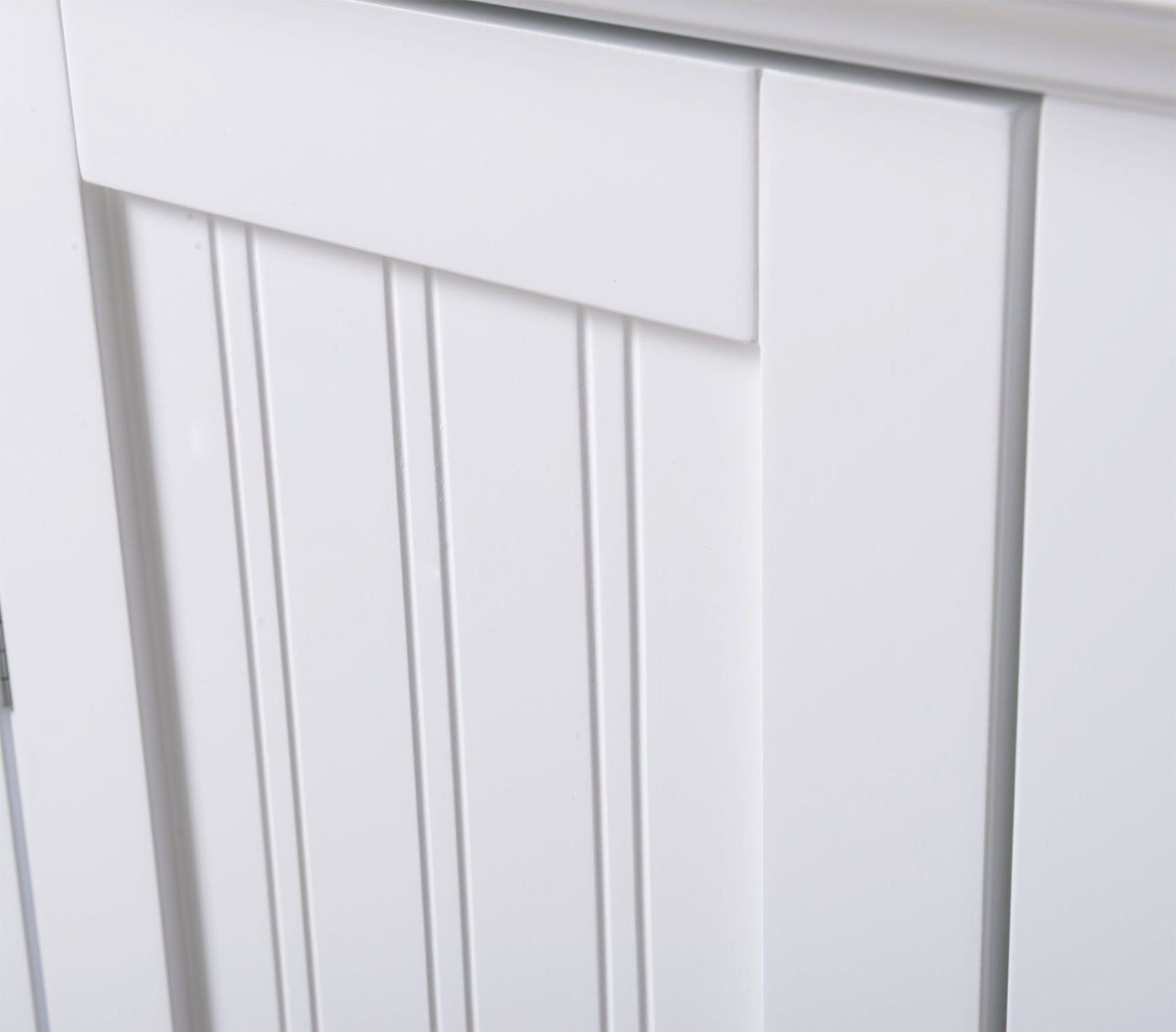 Add truly multi functional storage to almost any room while giving up minimum floor space. The tapered legs and attractive painted, vein lined, raised panel doors Add a stylish presence as well as ample storage. Includes a total of five shelves, three of which are adjustable or removable.