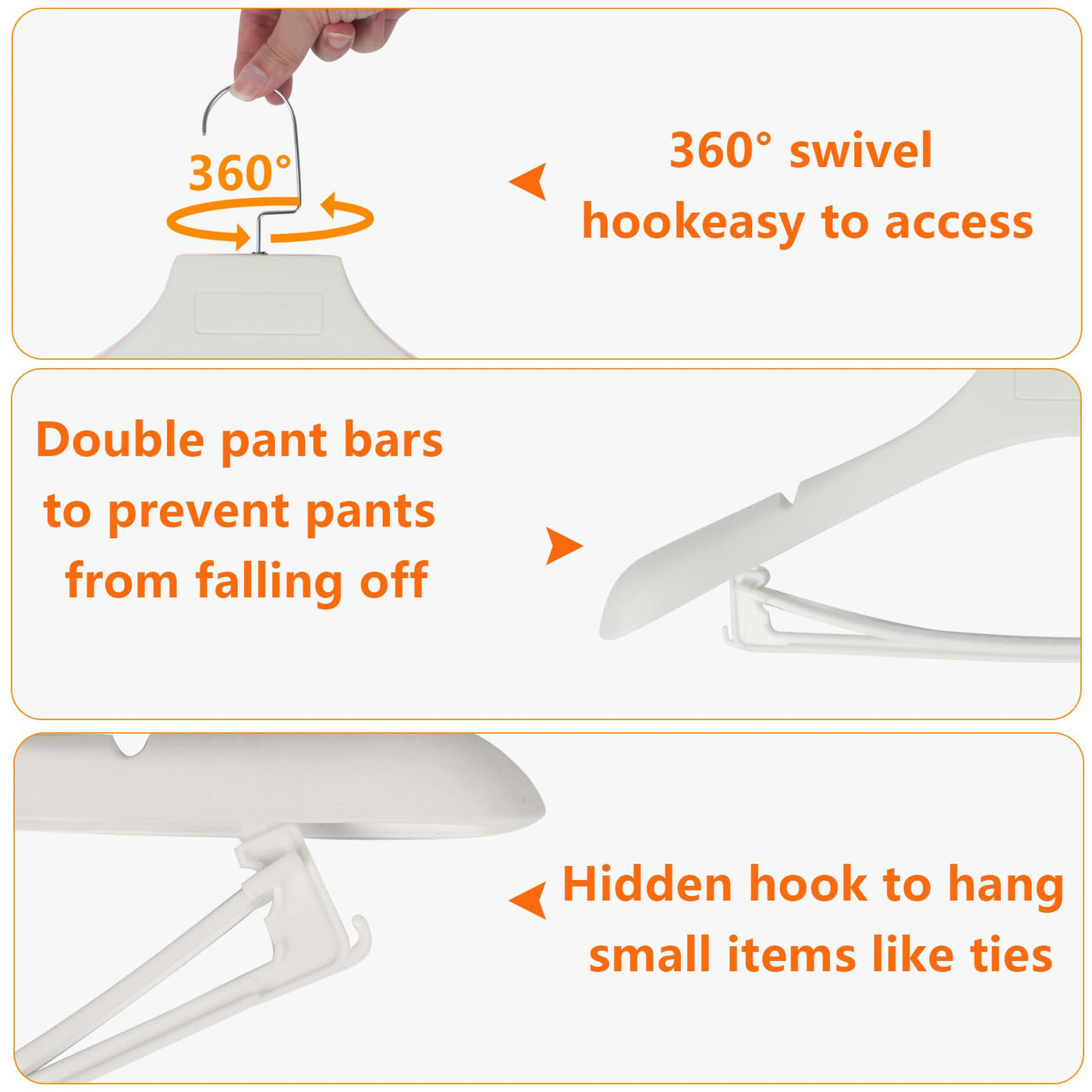 Features Product Name: Suit Hangers With Pant Holder 10 Pack/Coat Hangers/Sweater Hangers/Jacket Hanger Product Material: Plastic Product Size: 17.3'' 9.4'' 2'' Product Weight: About 3.5Lbs Multiple Quantity Options:Suit Hangers With Pant Bars 10 Pack, Coat Hangers With Pant Bars 15 Pack, Sweater Hangers With Pant Bars 20 Pack, Suit Hangers With Pant Bars 30 Pack, Suit Hangers With Pant Bars 40 Pack, Suit Hangers With Pant Bars 50 Pack Multiple Color Options: Black, White, Grey, Brown, Natural, Ivory White, Blue, Pink Product Scope Of Application: Suit Hangers With Pants Bar Suitable For Suit, Camisole, Jacket, Pants, Sweater, Pants, Heavy Clothes &Amp; More Package Includes: