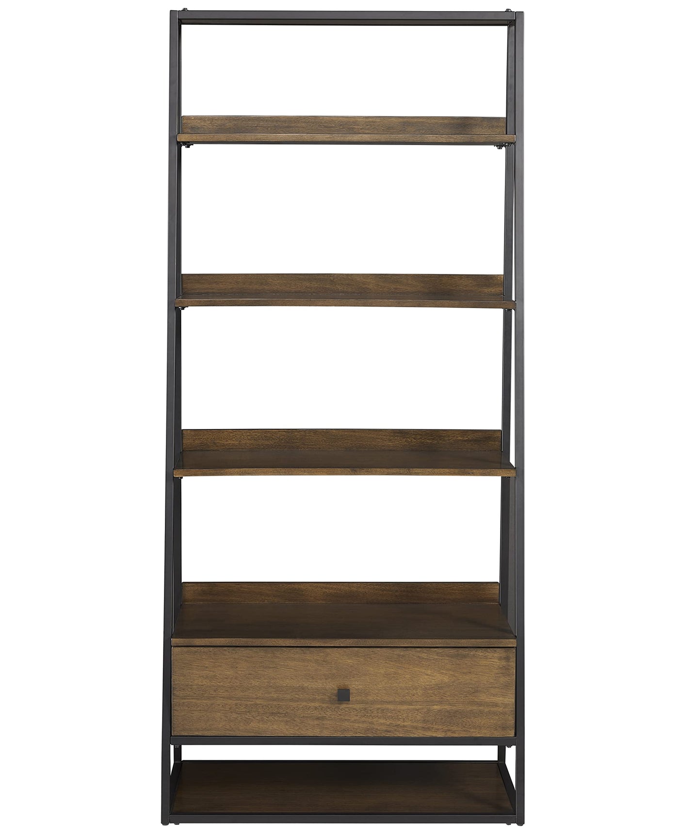 A modern style bookcase with classic understated appeal. Clean lines with mango veneers finished in a warm medium toned Cinnamon color combined with a black metal frame. Generous sized drawer and full open shelves are perfect for storage and display. Great for your home office or organizational needs.