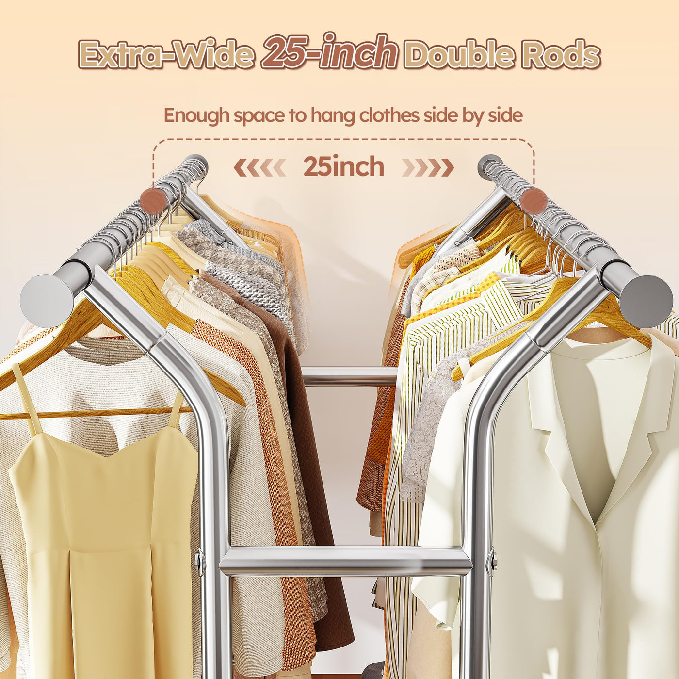 Q: Does the clothes rack have wheels for mobility?A: Yes, this clothing rack is equipped with four durable rubber wheels, including two lockable wheels to keep it securely in place while providing easy mobility across various floor surfaces.