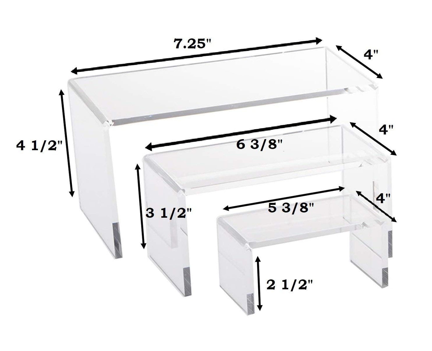 Rj Displays-3 Piece Each Acrylic Risers In Graduated Heights Of 5 3/8'' Inch, 6 3/8'' Inch, 7 1/4'' Inches Wide Crystal Clear Acrylic Display Riser Set, Acrylic Display Stand (6 Piece Set. )Use These Rises For Center Pieces, To Displays Figures, Collectibles, Cupcakes, Sweets, Food Trays, Jewelry Etc. Very Sturdy And Crystal Clear. Will Not Obstruct. Good Verity Of Sizes And Heights. With Different Heights All Products Displayed Will Show. Comes With Micro Fiber Cleaning Cloth