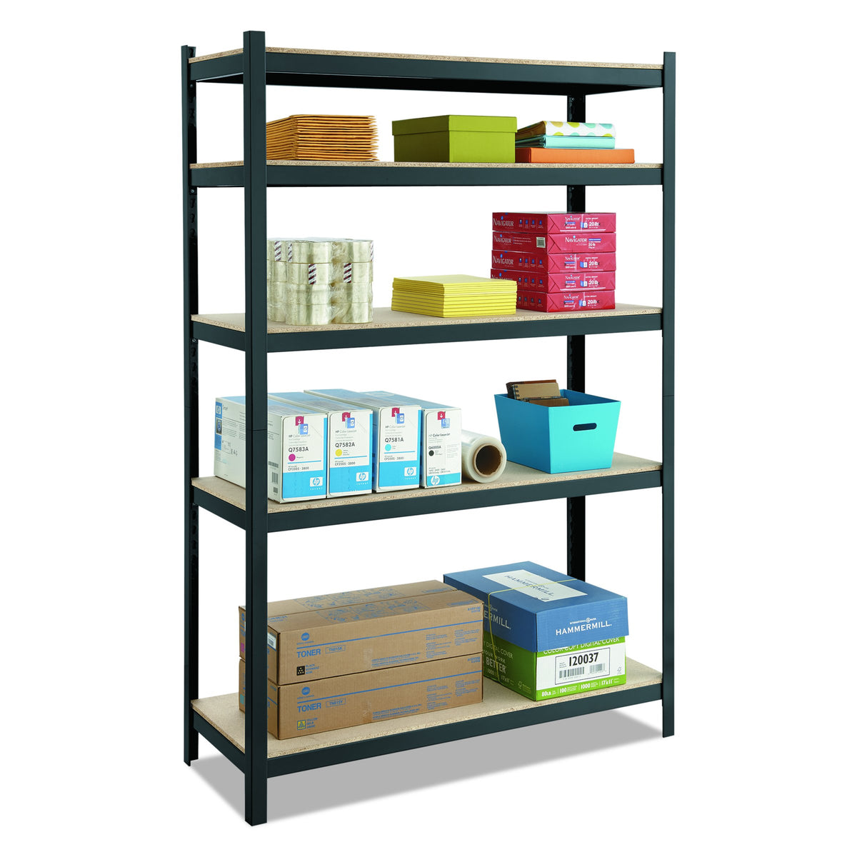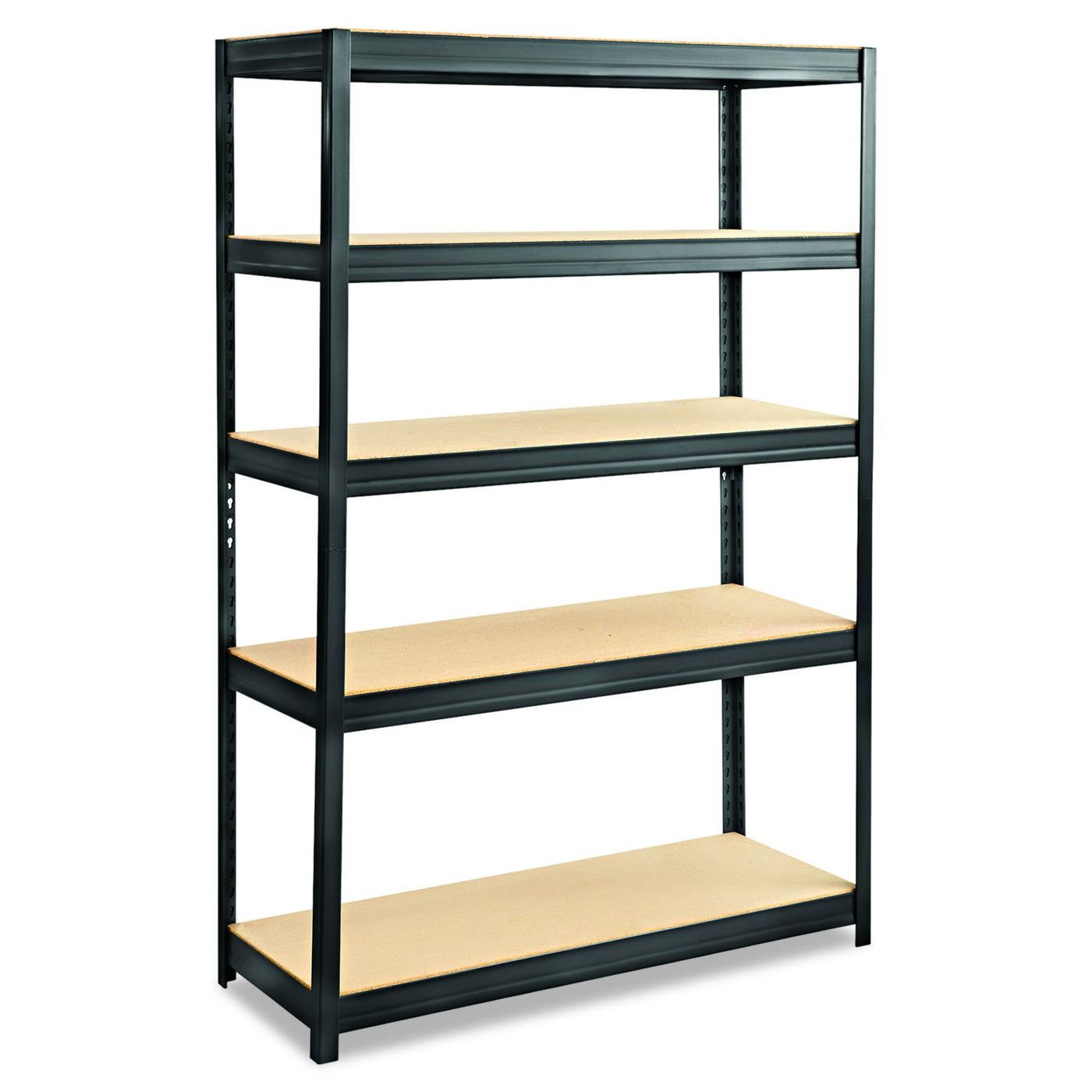 Stay strong with this boltless steel shelving unit. The sturdy steel construction is perfect for all the heavy duty shelving requirements found in the office, commercial and industrial environments. The flexible design allows the unit to be set up as a 5 shelf 72-Inch high shelving unit, or a 36-Inch high workbench. This unit will lend a clean look to any space with its hidden assembly and smooth lines. And depending on your needs, you can adjust the shelves in 1-Inch increments. No need to take your time putting this one together, it assembles with no tools needed. Strength, utility and ease its the perfect shelving unit. Includes particle board shelves. Powder coat finish in black.